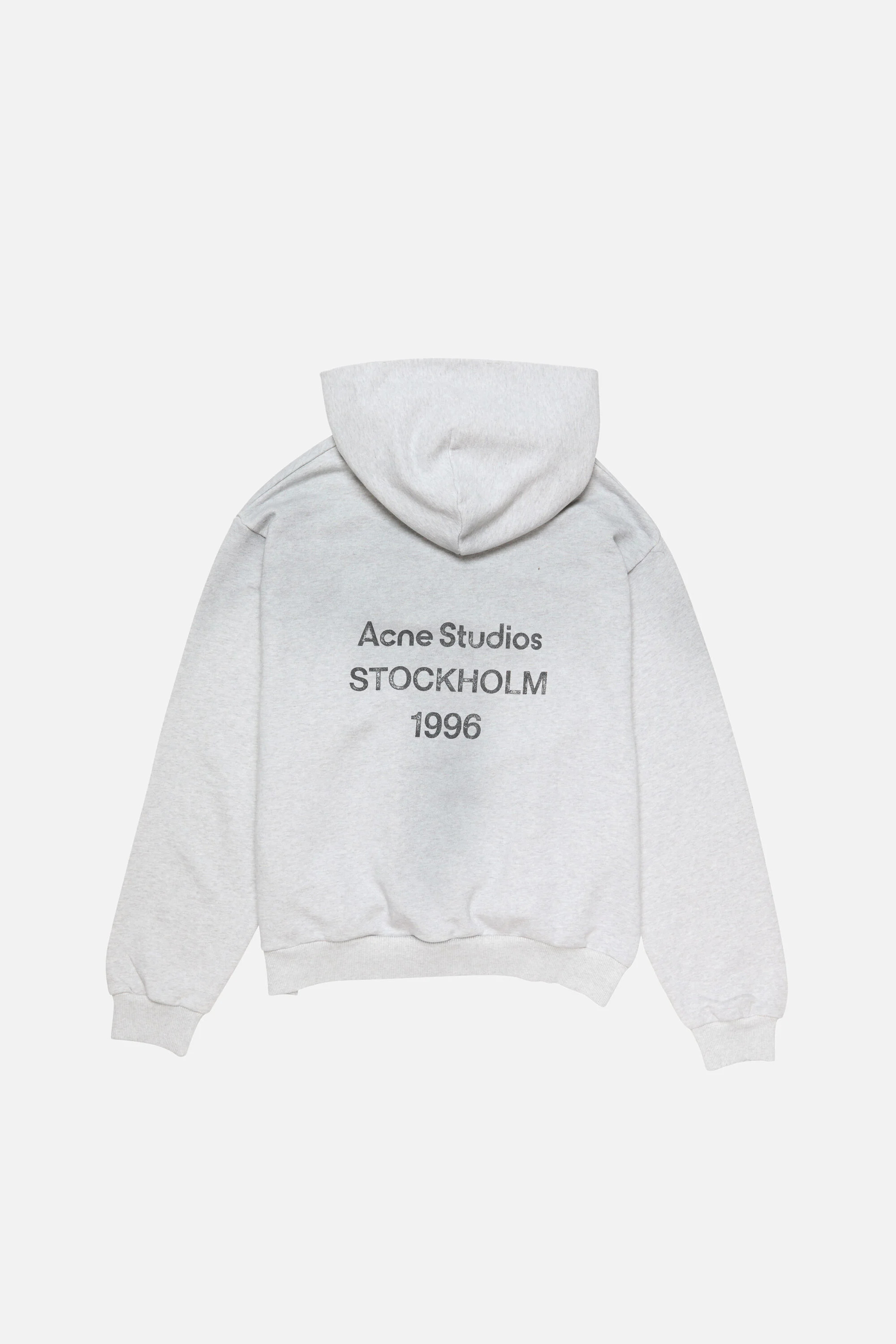Hooded sweater is cut to a relaxed unisex fit with dropped shoulders and below-hip length. Detailed with an Acne Studios logo stamp print at the back, crafted from a fleece cotton blend with a vintage sprayed effect. - Relaxed unisex fit - Dropped shoulders - Below hip length - Hooded - Sprayed finish - Logo at the back Acne Studios 1996 - Distressed details at the cuffs and hem - Female model is 176 cm / 5′10 and wears a size XS - Male model is 188.5 cm / 6′2 and wears a size M - Style ID: FN-UX-SWEA000023 - Made with organically grown cotton and recycled polyester. - Shell: 89% Organic cotton, 11% Recycled polyester