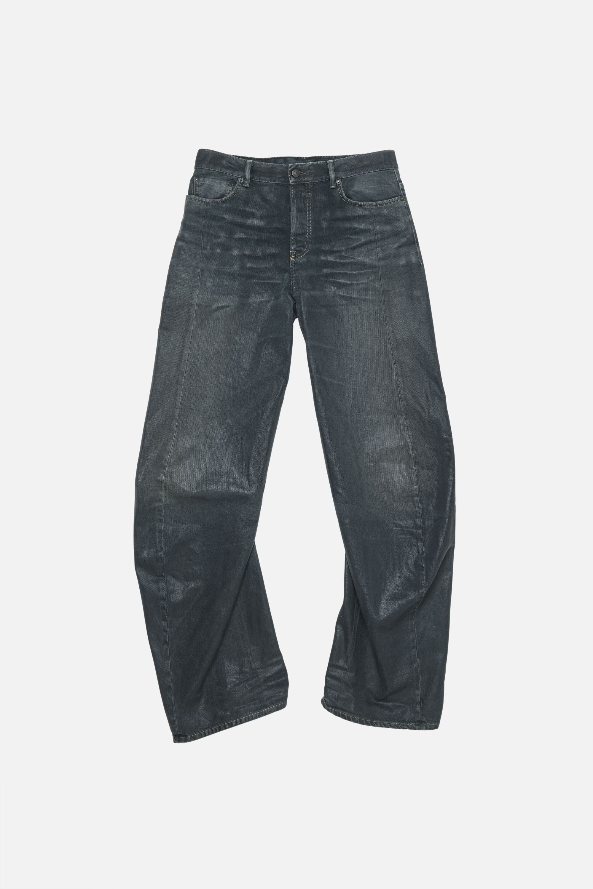 2006 jeans are crafted from dark ring denim with a shiny black coated finish, featuring 3D whiskers and creases. The glossy coating fades toward the waistband to reveal the denim base. Cut to a loose fit with a low waist and wide leg. - 5-pocket denim - Loose fit - Low waist - Wide leg - Long length - Button fly closure - Model is 178 cm / 5'8 and wears a size 27/34 - Style ID: ACNE STUDIOS 2006F GLOSSY - Made with organically grown cotton - Shell: 100% Cotton, Patch: 100% Cow leather