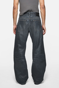 2006 jeans are crafted from dark ring denim with a shiny black coated finish, featuring 3D whiskers and creases. The glossy coating fades toward the waistband to reveal the denim base. Cut to a loose fit with a low waist and wide leg. - 5-pocket denim - Loose fit - Low waist - Wide leg - Long length - Button fly closure - Model is 186 cm / 6'1 and wears a size 29/34 - Style ID: ACNE STUDIOS 2006M GLOSSY - Made with organically grown cotton - Shell: 100% Cotton, Patch: 100% Cow leather
