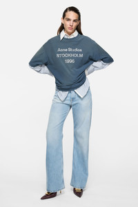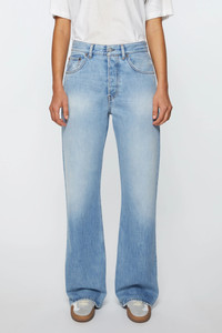2021 jeans are cut to a loose fit with mid-waist, wide leg and long length. Made from rigid denim in light blue wash. - Loose fit - Mid waist - Wide leg - Long length - This item runs large, we recommend choosing a size down - 5-pocket construction - Button fly - Model is 179cm/ 5'11 and wears a size 27/34 - Style ID: Acne Studios 2021F Light Blue Trash Eco - Made from organically grown cotton - Shell: 100% Cotton, Patch: 100% Cow leather