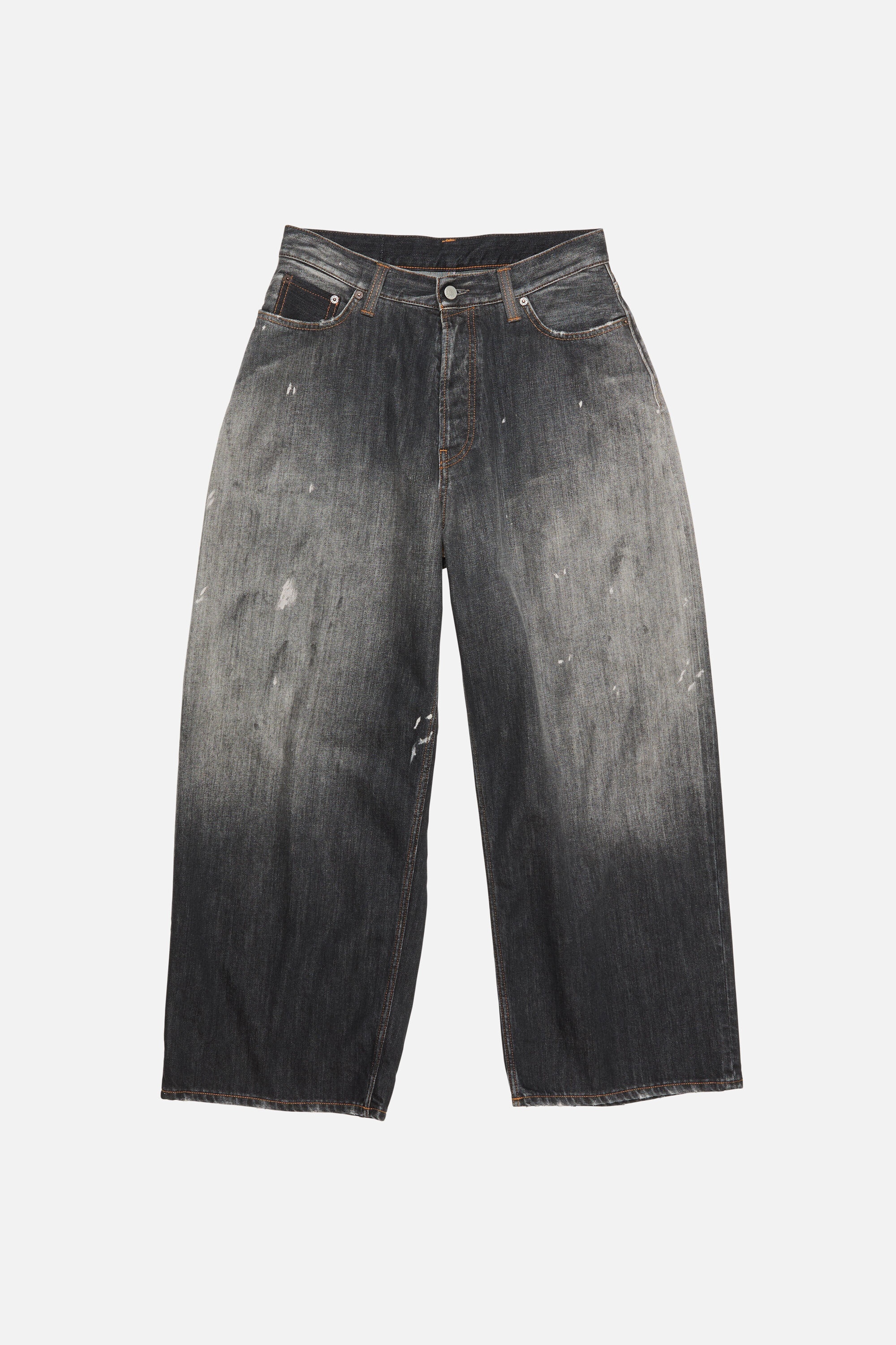 Cut to a loose fit with a low waist, super baggy leg, and extra-long length. Crafted from non-stretch denim in a black wash, the 2023 jeans feature manual dirt and paint marks, finished with leather patch pockets and belt loops. - Loose fit - Low waist - Super baggy leg - Long length - These jeans are an oversized style, size up for an even more exaggerated look. - Leather pockets and belt loops - 5-Pocket construction - Button fly - Female model is 180 cm / 5′9 and wears a size Small, Regular corresponds to size 36 and denim 27 - Male model is 185 cm / 6' and wears a size Small, Regular corresponds to size 46 and denim 29 - Style ID: Acne Studios 2023 U Black Trafalgar Leather - Shell: 100% Cotton, Contrast: 100% Cow leather, Patch: 100% Cow leather
