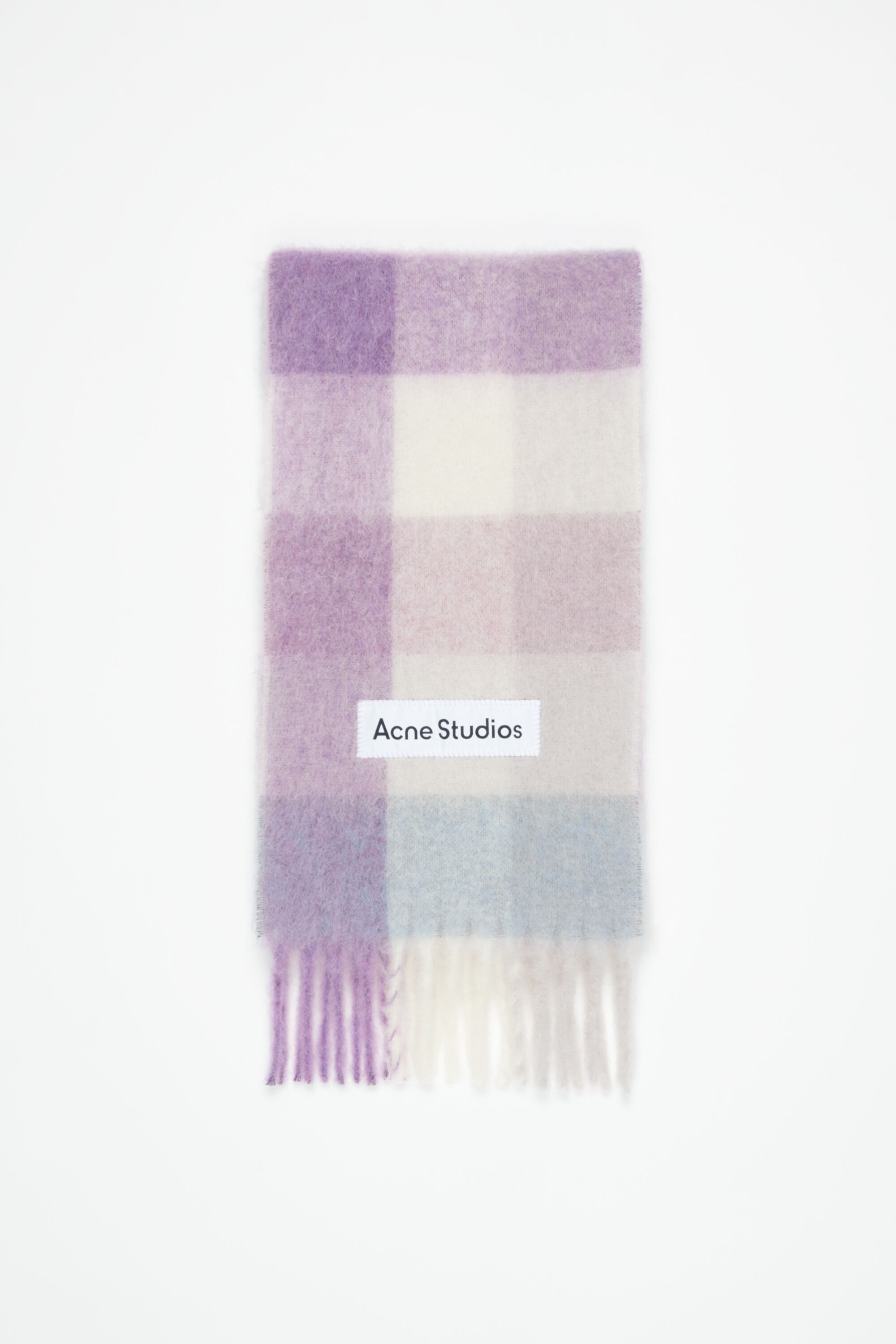 Checked scarf made of a soft mohair blend with fringed ends, made from carefully selected material known for its soft and hairy fibres. Detailed with an Acne Studios embroidered logo. - Checked - Embroidered logo - Fringed ends - Soft wool/mohair blend - Measurements including fringe: 250 cm x 28 cm - Fringe measurements: 12 cm approx. - Made in Italy - Style ID: FN-UX-SCAR000115 - Due to the characteristics of the material, it is natural for small fibres to shed over time. Handle with care to preserve the original appearance as long as possible. - Shell: 33% Alpaca, 25% Wool, 22% Nylon, 20% Responsible mohair
