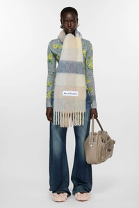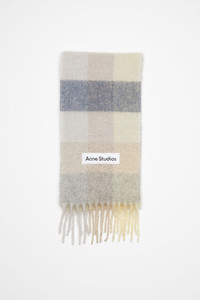 Checked scarf is made of a soft mohair blend with fringed ends. Detailed with an Acne Studios embroidered logo. Crafted from carefully selected material known for its soft and hairy fibres. - Check - Logo patch - Fringed ends - Measurements including fringe: 250 cm length; 28 cm width - Fringe measurements: 12 cm approx. - Made in Italy - Style ID: FN-UX-SCAR000115 - Due to the characteristics of the material, it is natural for small fibres to shed over time. Handle with care to preserve the original appearance as long as possible. - Shell: 33% Alpaca, 25% Wool, 22% Nylon, 20% Responsible mohair