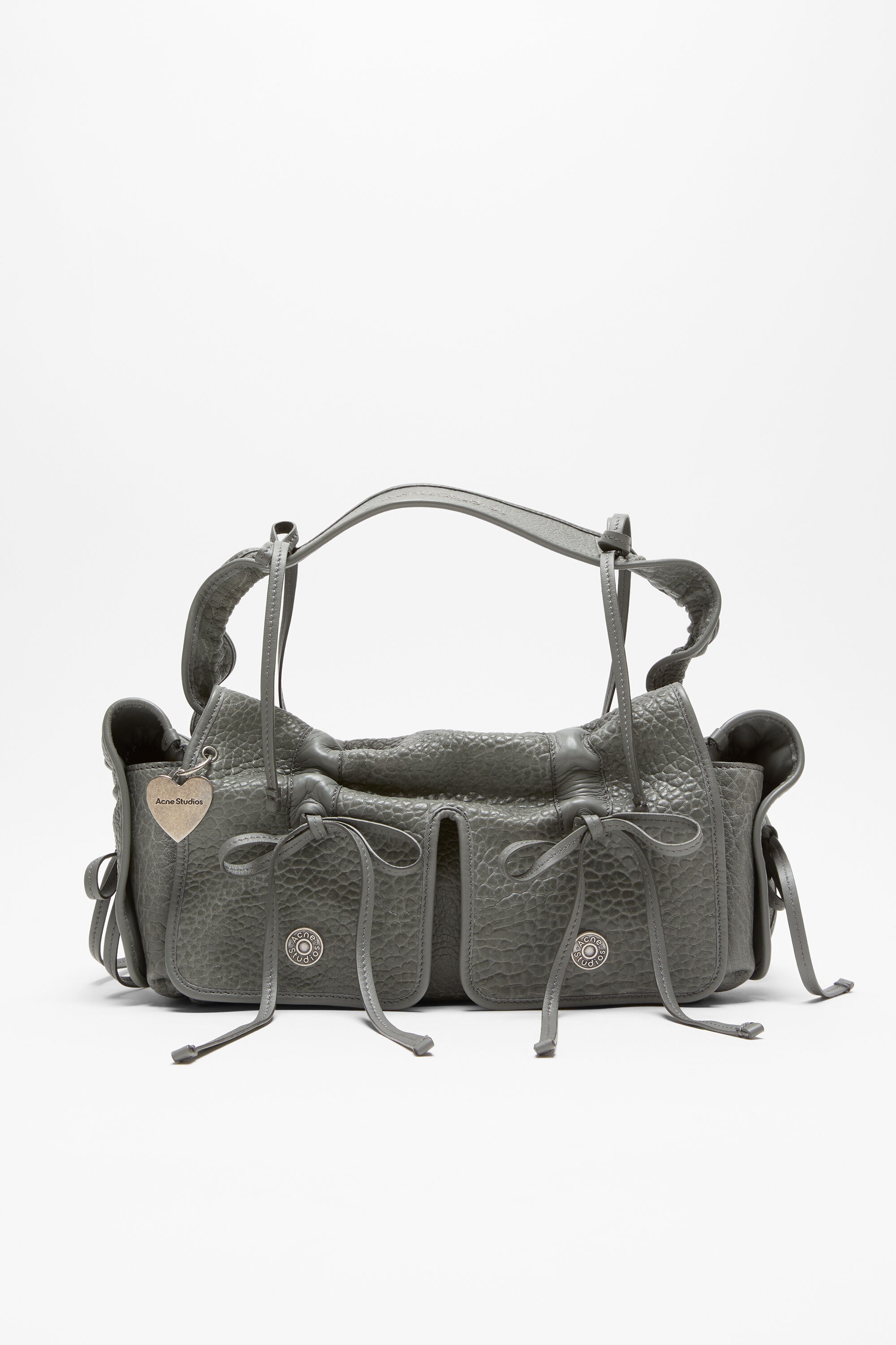 Multipocket bag is crafted from grained bubble leather adorned with laced knot details. Complete side flap pocket with a discrete magnetic closure and spacious interior. Includes a top handle and long strap. Complete side flap pocket with a discrete magnetic closure, spacious interior and adjustable shoulder strap. - Multipocket construction - Front knot details - Two side pockets - Top handle - Measurements: 13 cm; 33 cm; 11 cm - Adjustable shoulder strap length: 45 cm to 75 cm - Protective dustbag - Made in Italy - Style ID: Multipocket Big Grainy - Shell: 100% Preferred lamb leather, Lining: 100% Preferred lamb leather