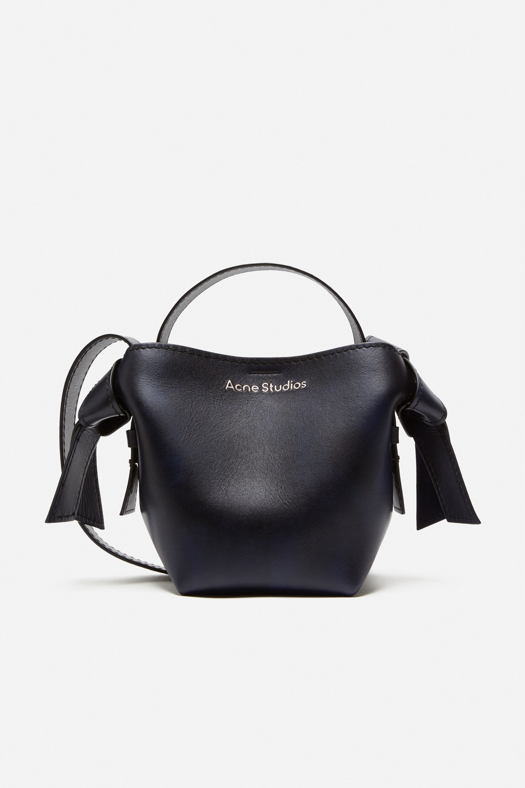 Mini shoulder bag featuring twisted Musubi knots on each side, inspired by traditional Japanese obi sashes. Crafted from soft, semi-shiny leather treated for an aged look, and finished with a silver embossed Acne Studios logo. Includes an interior zip pocket with branded zip puller, and a detachable, adjustable shoulder strap. - Shoulder bag - Musubi knot - Embossed logo - Top handle - Detachable shoulder strap - Interior compartment - Snap button closure - Protective dustbag included - Measurements: 21,5 cm; 20,5 cm; 15,5 cm - Shortest strap length: 105 cm: longest strap length: 125 cm - Smaller drop: 40 cm; bigger drop: 50 cm. - Number of length adjustment possible: 5. - Handle and strap width: 4.5 cm - Style ID: FN-WN-BAGS000453 - Made in Italy - Shell made from leather from a Leather Working Group (LWG) certified tannery with Silver rating - Shell: 100% Calf leather, Lining: 100% Lamb leather