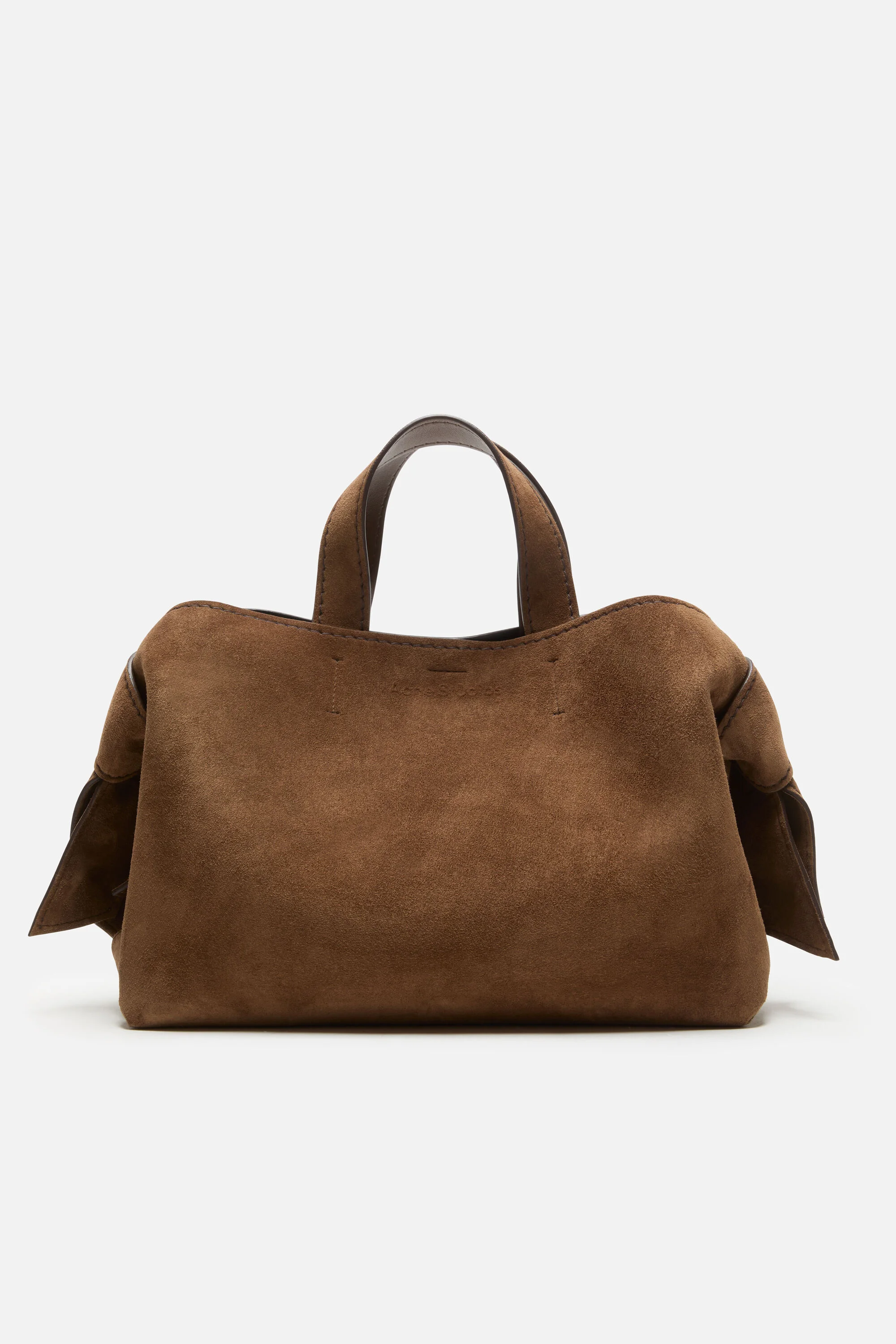 Musubi tote bag crafted from soft suede with contrast stitching, adorned with a musubi knot on each side inspired by traditional Japanese obi sashes. Features a shoulder strap, interior zip compartment with branded lanyard, and an embossed Acne Studios logo. Completed with a snap button closure. - Side knot detail - Interior zip compartment pocket with branded lanyard - Embossed Acne Studios logo - Snap button closure - Measurements: 260 × 345 × 155 mm - Strap total length: 102 cm - Shortest strap length: 75 cm; longest strap length: 93 cm - Smaller drop: 23.5 cm; bigger drop: 33 cm - Number of length adjustments possible: 3 - Handle and strap width: 3.5 cm - Protective dustbag included - Made in Italy - Style ID: AC-UX-BAGS000037 - Shell made from leather from a Leather Working Group (LWG) certified tannery with Silver rating. - Shell: 100% Calf leather, Lining: 100% Lamb leather