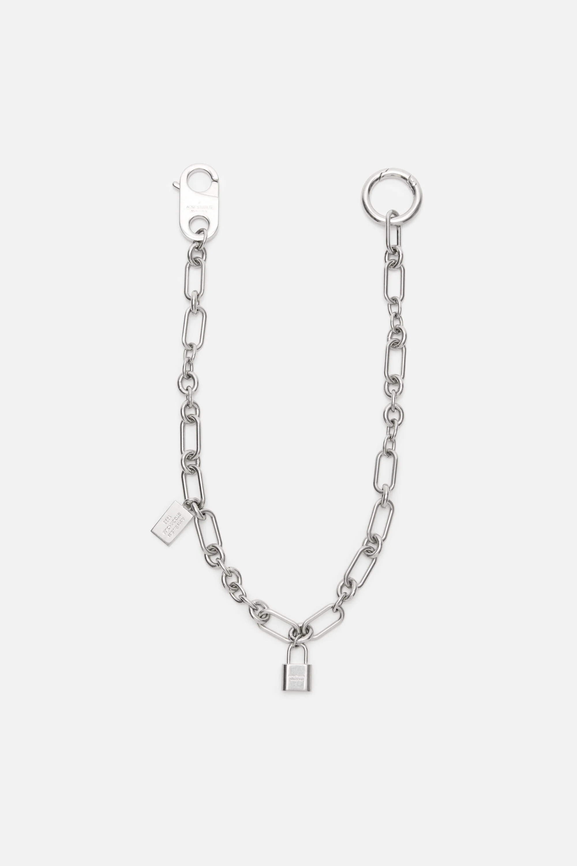 Chain keyring featuring padlock charms with an engraved “Acne Studios 1996” logo. Designed in celebration of the Year of the Horse and finished in silver and complete with a metal plaque stamped with the signature logo. - Chain keyring with padlock charms - “Acne Studios 1996” engraved logo - Silver-finish hardware - Metal plaque with engraved logo - Total length: 540 mm - Style ID: AC-UX-ACCS000004 - Shell: 100% Brass