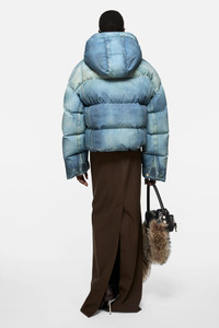 Puffer down jacket crafted from water-repellent nylon with a denim trompe-l’oeil print. Designed with a raised neckline and hood, welt pockets, and a padded silhouette. Cut to a relaxed fit and below-waist length. - Relaxed fit - Below-waist length - Denim trompe-l’oeil print - Raised neck and hood - Welt pockets - Zipper and snap button closure - Fully lined - Model is 178 cm / 5'8 and wears a size S - Style ID: FN-WN-OUTW001061 - Filling made from recycled down and recycled feathers - Shell: 100% Polyester, Lining: 100% Nylon, Filling: 90% Duck down, 10% Duck feathers