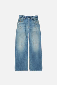 Jeans crafted from loosely constructed, lightweight slubby cotton denim with a vintage eco stone wash, featuring paint marks, holes, and dirt. Every garment will differ. 2021 jeans are cut to a regular fit with a mid waist, wide straight leg with a slight flare from the knee, and long length. - Regular fit - Mid waist - Wide straight leg with a slight flare from the knee - Long length - Paint marks, holes, and dirt. Every garment will differ. - Model is 178 cm / 5'8 and wears a size 27/34 - Style ID: Acne Studios 2021F Mid Blue Trafalgar - Made from organically grown cotton - Shell: 100% Cotton, Patch: 100% Cow leather