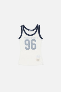 Tank top crafted from lightweight ribbed fabric with a semi-sheer finish. Features a seasonal branded graphic and a logo label. Cut in a fitted style with a hip-length cut. - Fitted tank top - Hip length - Semi-sheer - Seasonal branded graphic - Logo label - Model is 180 cm / 5'9" and is wearing a size S - Style ID: FN-WN-TSHI000766 - Shell: 82% Viscose, 18% Nylon, Contrast: 96% Organic cotton, 4% Elastane