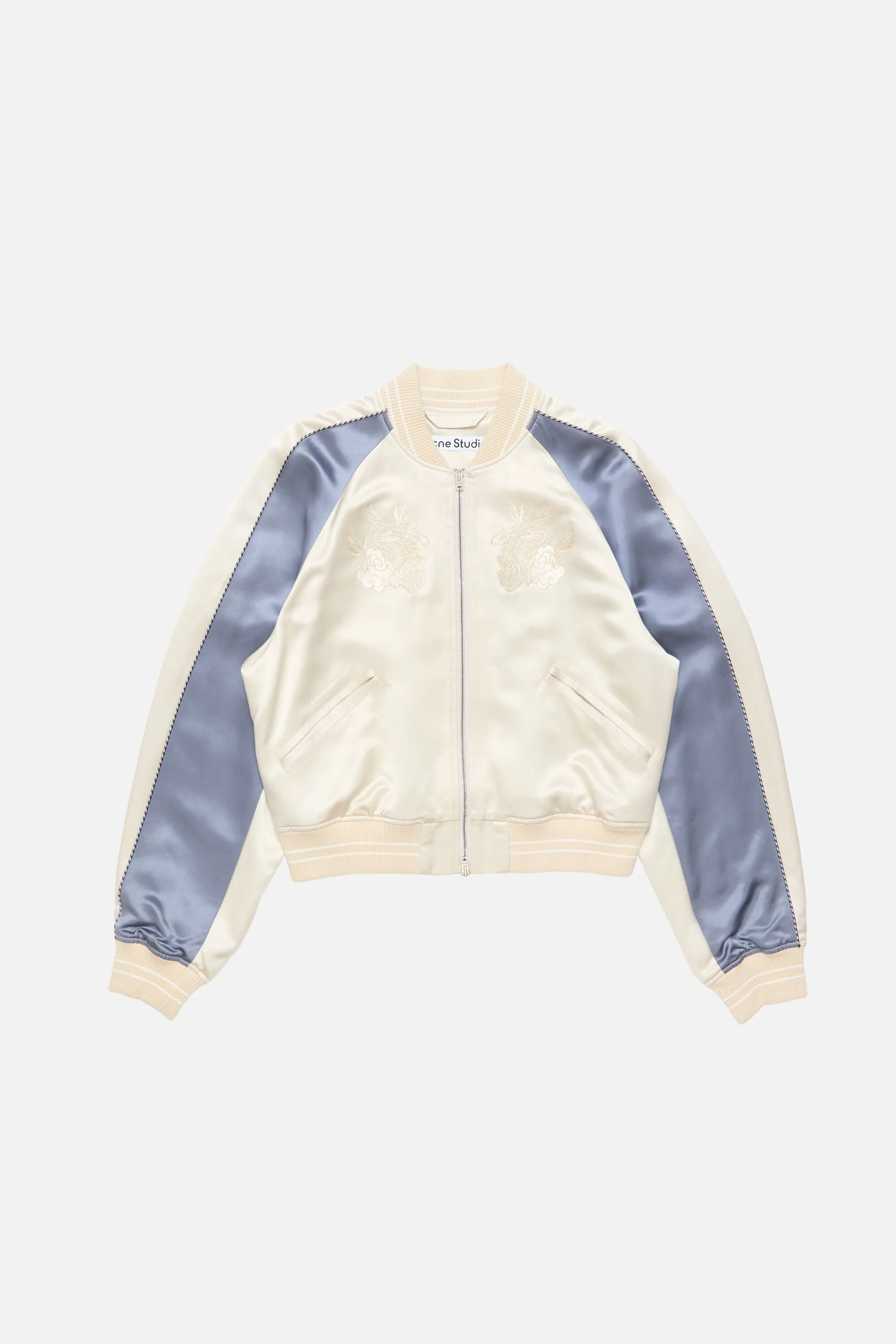 Bomber jacket crafted from rich satin, featuring embroidered seasonal dragon artwork on the chest and back. Designed with contrasting panels and piping, two-way zip closure, welt pockets with snap buttons, and ribbed trim. Cut to a regular fit and below-waist length. - Regular fit - Below-waist length - Embroidered seasonal dragon artwork on chest and back - Contrasting panels and piping - Two-way zip closure - Welt pockets with snap button closure - Ribbed neckline, cuffs, and hem - Model is 190 cm / 6'2 and wears a 46 - Style ID: FN-MN-OUTW001291 - Made with recycled nylon - Shell: 55% Acetate, 45% Polyester, Lining: 100% Viscose