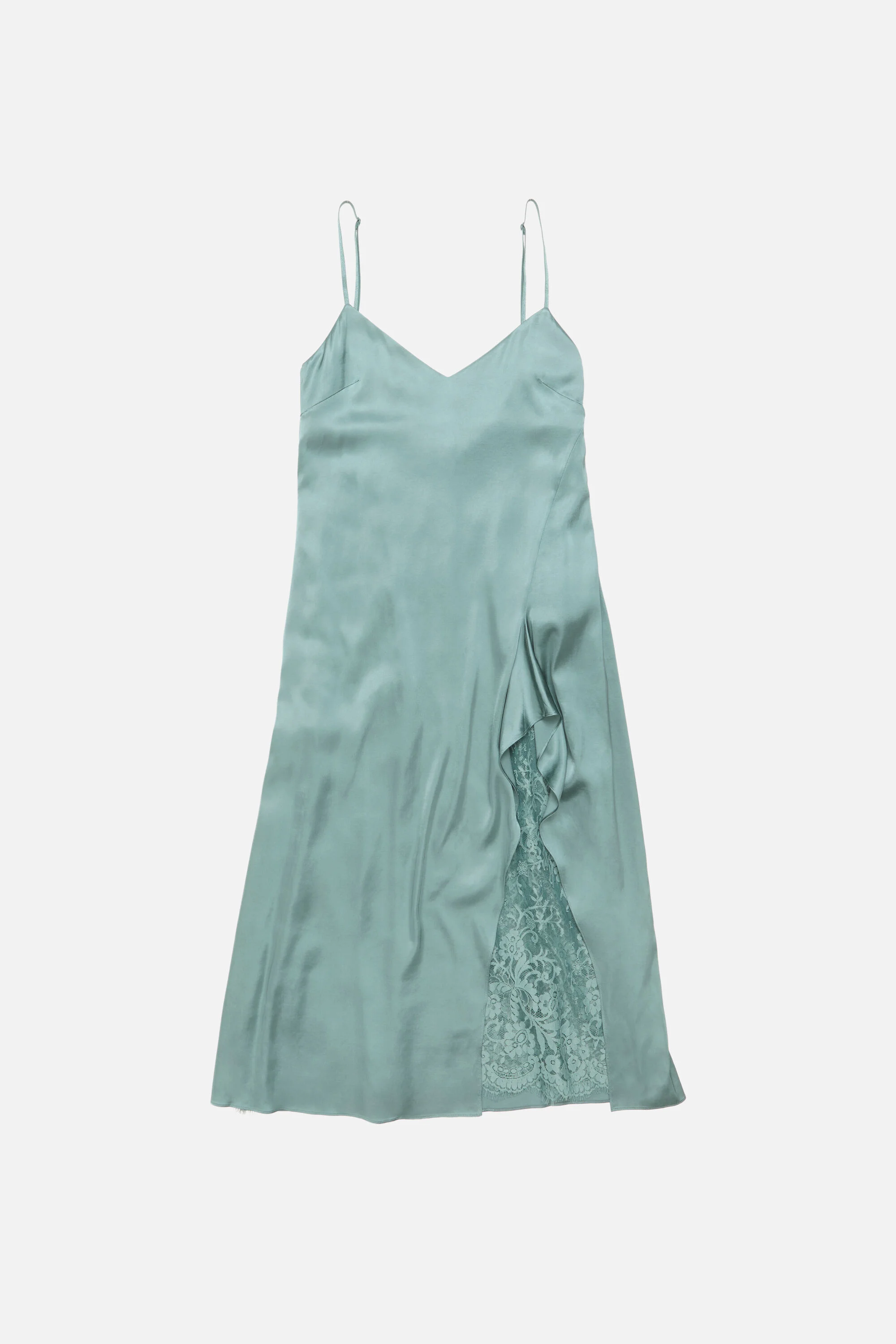 Midi dress crafted from shiny, fluid satin featuring a ruffled slit revealing delicate lace detail. Complete with elasticated adjustable straps and an invisible zip closure. Cut to a fitted silhouette and mid-calf length. - Fitted silhouette - Mid-calf length - Ruffled slit with lace detail - Elasticated adjustable straps - Invisible zip closure - Model is 177 cm / 5'10 and wears a 36 - Style ID: RW-WN-DRES000022 - Made with recycled nylon - Shell: 97% Viscose, 3% Elastane, Contrast: 48% Nylon, 52% Cotton
