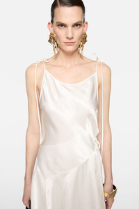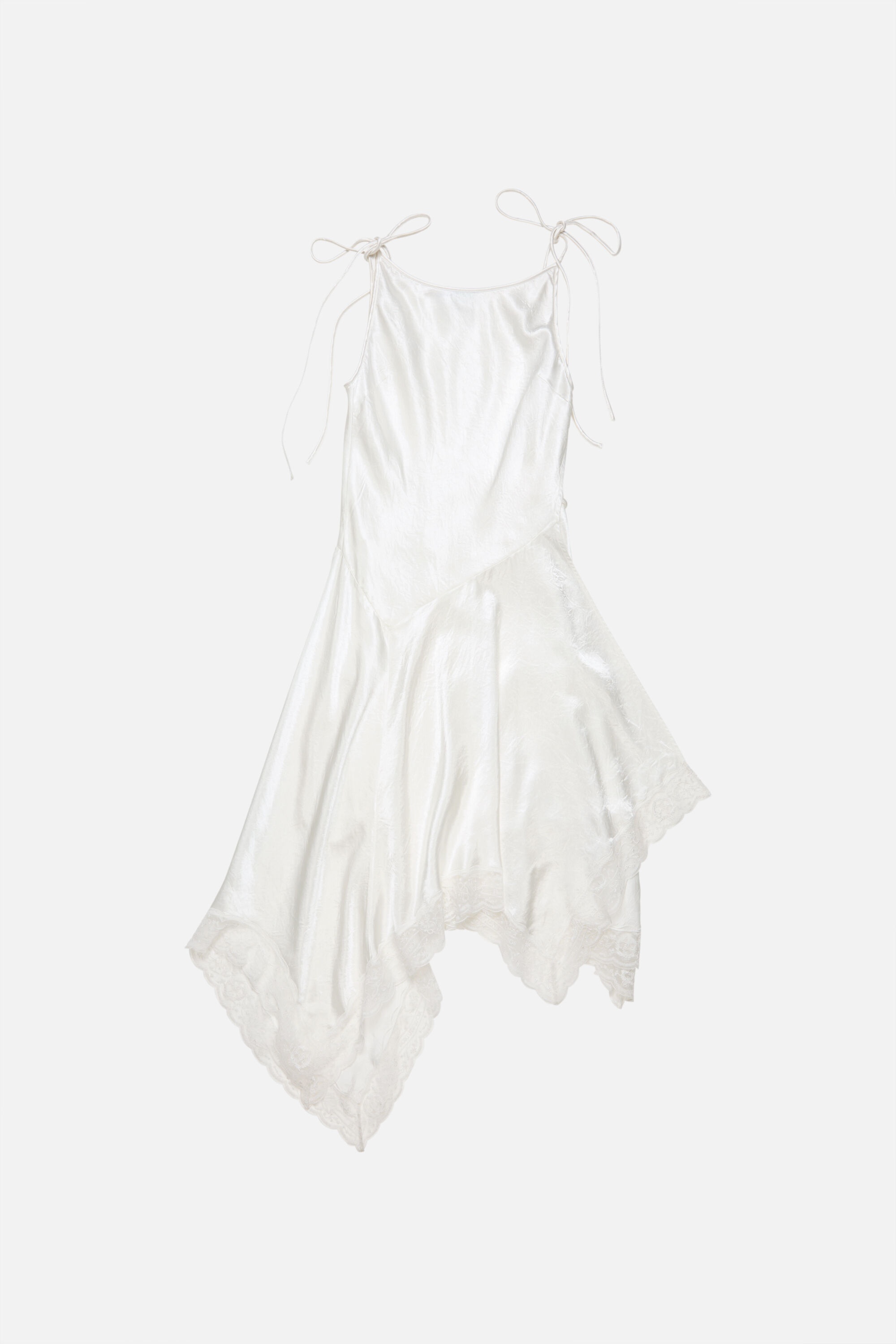 Bias-cut dress crafted from fluid satin with a textured, crinkled finish. Designed with a tie-up wrap construction, adjustable shoulder straps, and a logo lace detail at the hem. Cut to a regular fit with an asymmetrical length. - Regular fit - Asymmetrical length - Adjustable shoulder straps - Contrast top stitching - Wrap tie-up closure - Model is 180 cm / 5′9 and wears a size 36 - Style ID: FN-WN-DRES001549 - Shell: 100% Acetate, Contrast: 100% Nylon