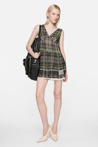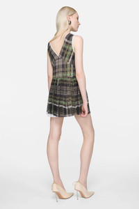 Sleeveless dress crafted from textured silk with a grainy handfeel, featuring an optic check design, a front bow, and a pleated skirt. Cut to a regular fit and midi length. - Sleeveless midi dress - Regular fit - Optic check design - Front bow - Pleated skirt - Invisible zip closure - Model is 178 cm / 5'8" and wears a 36 - Style ID: FN-WN-DRES001527 - Shell: 100% Silk, Lining: 100% Polyester