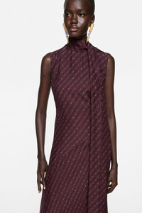 Draped sleeveless tunic dress crafted from lightweight, fluid silk with jacquard dots, featuring an attached scarf detail with a fringed end. Cut to a regular fit with an asymmetric mid-calf length. - Regular fit - Mid-calf length - Asymmetric hem - Attached scarf with fringe - Hook & eye and zipper back closure - Female model is 178 cm / 5'8 and wears a size 36 - Style ID: FN-WN-DRES001544 - Made in Italy - Shell: 100% Silk, Contrast: 100% Polyester