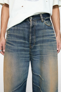 Jeans feature a strong contrast vintage wash with a coated tint on an indigo denim base, crafted from rigid denim made of a cotton blend. the 2023 jeans are cut to a super baggy fit with a mid waist, super wide leg and long length. - Supper baggy fit - Mid waist - Super wide leg - Long length - Back leather patch - 5-pocket denim construction - Button fly - Female model is 180cm/ 5'11 and wears a size 26/34 - Male model is 188 cm / 6'2 and wears a size 30/34 - Style ID: Acne Studios 2023 U Rocka - Shell: 80% Organic cotton, 20% Recycled cotton, Patch: 100% Cow leather