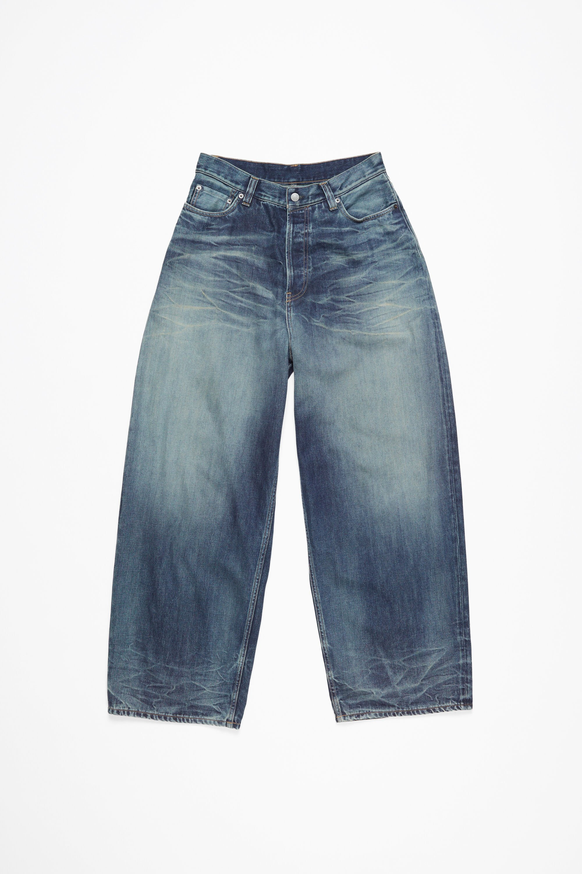 2023 jeans are cut to a super baggy fit with a mid waist, super wide leg and long length. Made from non stretch denim in a mid-blue wash. - Super baggy fit - Mid waist - Super wide leg - Long length - 5-pocket construction - Button fly - Model is 180cm/ 5'11 and wears a size 36 - Style ID: Acne Studios 2023F FN Broadway - Made with 80% organically grown cotton and 20% recycled cotton. - Shell: 80% Organic cotton, 20% Recycled cotton, Patch: 100% Cow leather