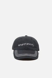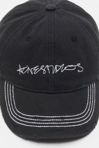 Six-panel baseball cap crafted from twill cotton with distressed details. Features seasonal Acne Studios logo embroidery on the front, contrast stitching, and an adjustable D-ring closure. - Six panel design - Acne Studios logo embroidery - Distressed details - Contrast stitching - Adjustable d-ring closure - Measurement: 59 cm - Style ID: FN-UX-HATS000348 - Main material made from organically grown cotton - Shell: 100% Cotton, Pocket Lining: 100% Cotton