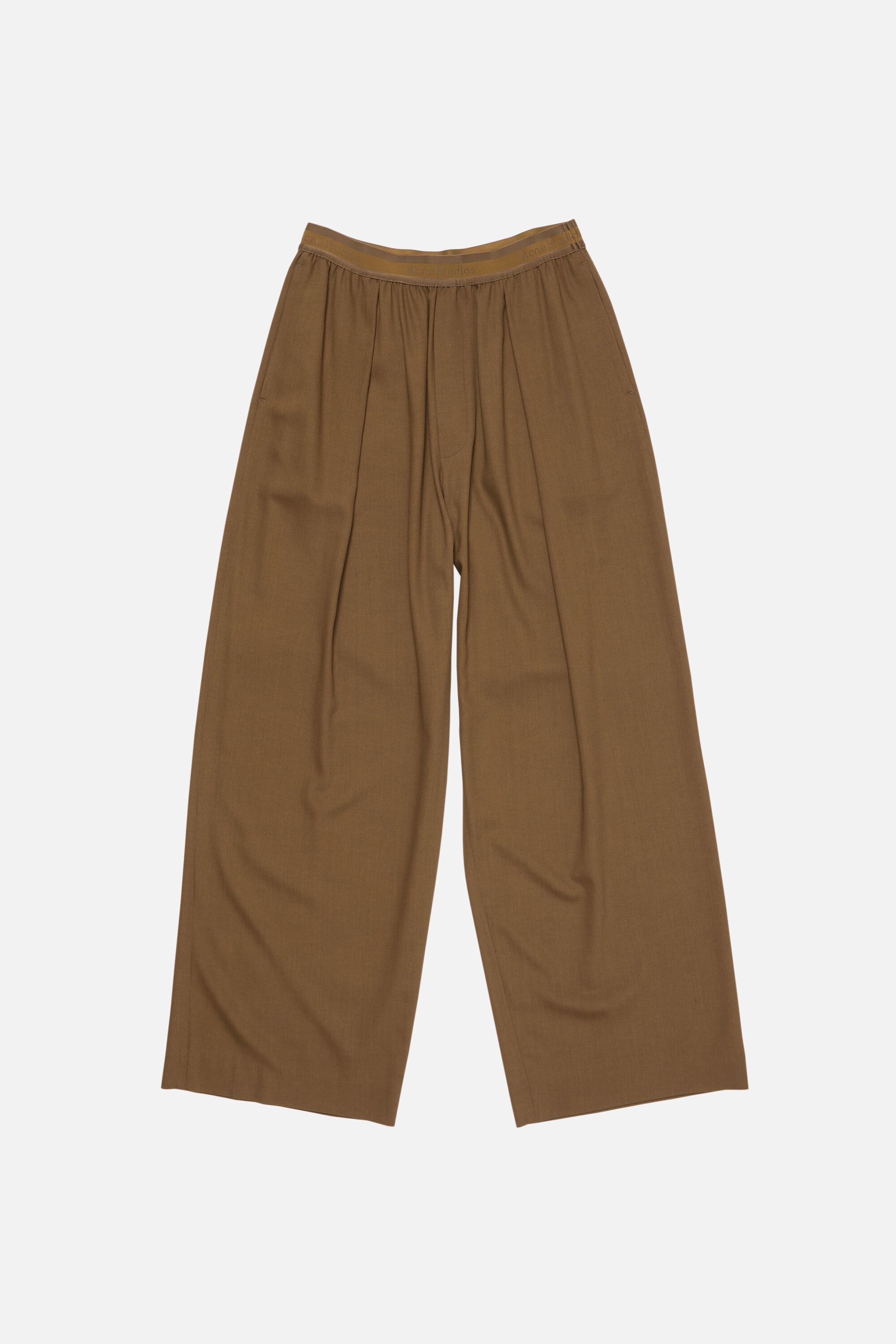 Casual trousers crafted from fluid wool suiting fabric, featuring a branded elasticated waistband, side seam pockets, and a faux zip fly. Cut to a regular fit with a mid waist and long, loose leg. - Regular fit - Mid waist - Loose leg with press creases - Side seam pockets - Back welt pocket - Model is 187 cm / 6'1 and wears a size 48 - Style ID: FN-MN-TROU001028 - Shell: 65% Viscose, 35% Wool