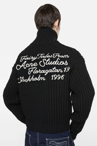 Zip-up cardigan crafted from chunky wool knit, featuring an embroidered seasonal logo on the back. It has a funnel neck, front welt pockets, and ribbed collar, cuffs, and hem. Cut to a regular fit and hip length. - Regular fit - Hip length - Embroidered logo - Front welt pockets - Zipper closure - Model is 187 cm / 6'2 and wears a size S - Style ID: FN-MN-KNIT000564 - Made in Italy - Shell: 100% Wool