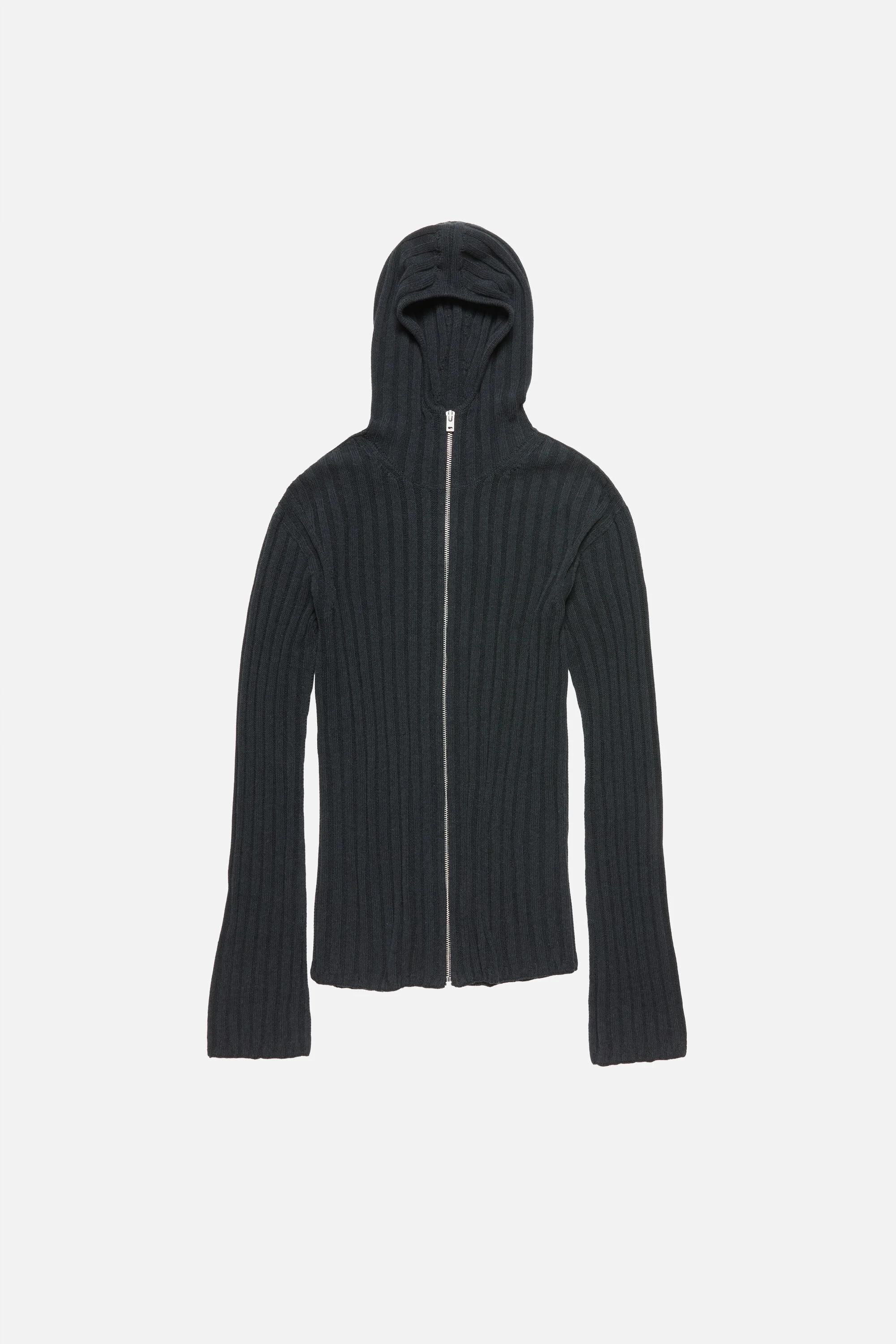 Zip-up hooded cardigan crafted from compact crepe ribbed cotton, featuring irregular rib detailing at the hem and cuffs, and a seasonal label at the back neck. Cut to a fitted style and hip length. - Fitted - Ribbed - Hip length - Hood - Zipper closure - Seasonal label on back neckline - Female model is 180 cm / 5'9" and wears a size XS - Male model is 187 cm / 6'1" and wears a size S - Style ID: FN-UX-KNIT000027 - Shell: 100% Cotton