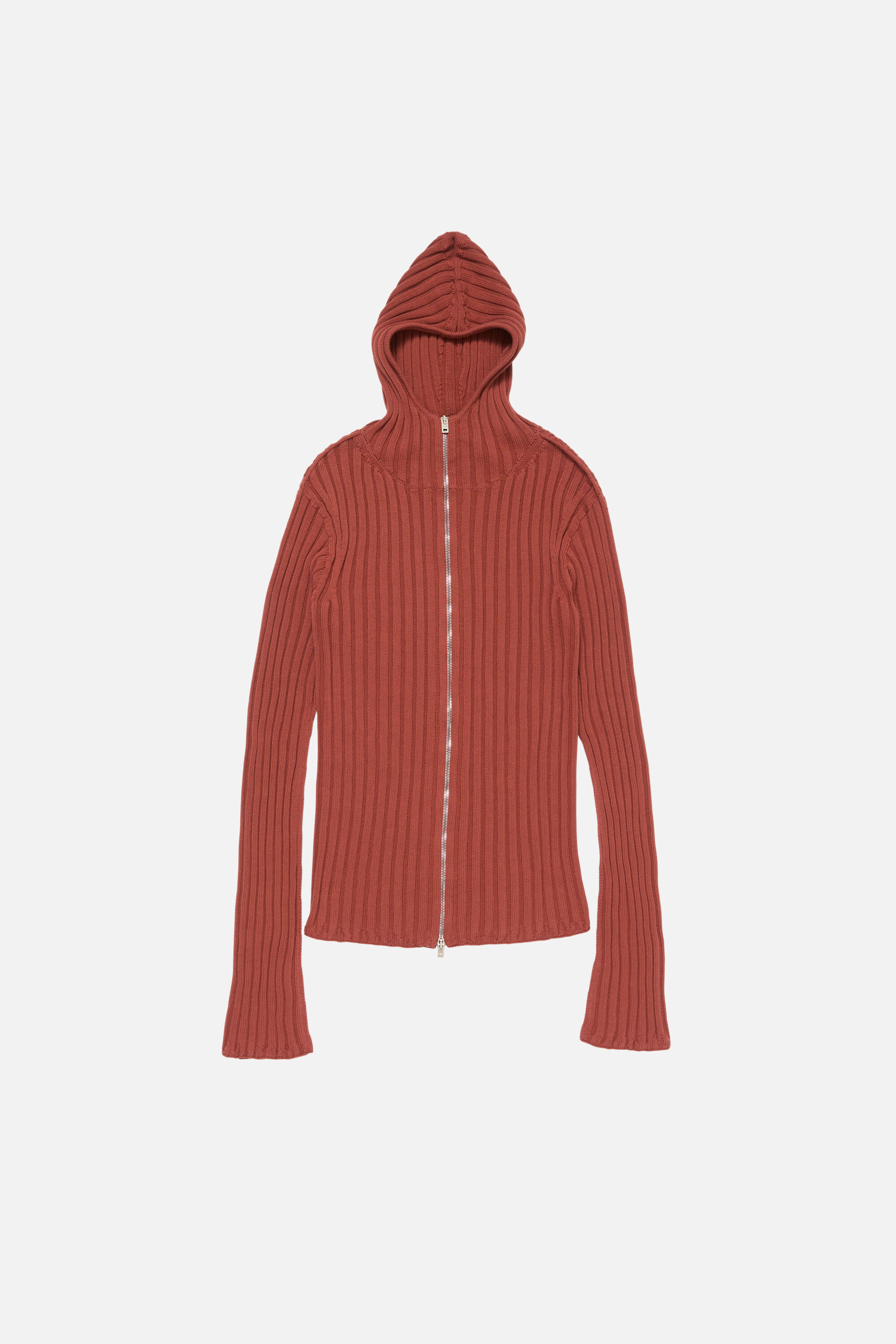 Zip-up hooded cardigan crafted from compact crepe ribbed cotton, featuring irregular rib detailing at the hem and cuffs, and a seasonal label at the back neck. Cut to a fitted style and hip length. - Fitted - Ribbed - Hip length - Hood - Zipper closure - Seasonal label on back neckline - Female model is 180 cm / 5'9" and wears a size XS - Male model is 187 cm / 6'1" and wears a size S - Style ID: FN-UX-KNIT000027 - Shell: 100% Cotton