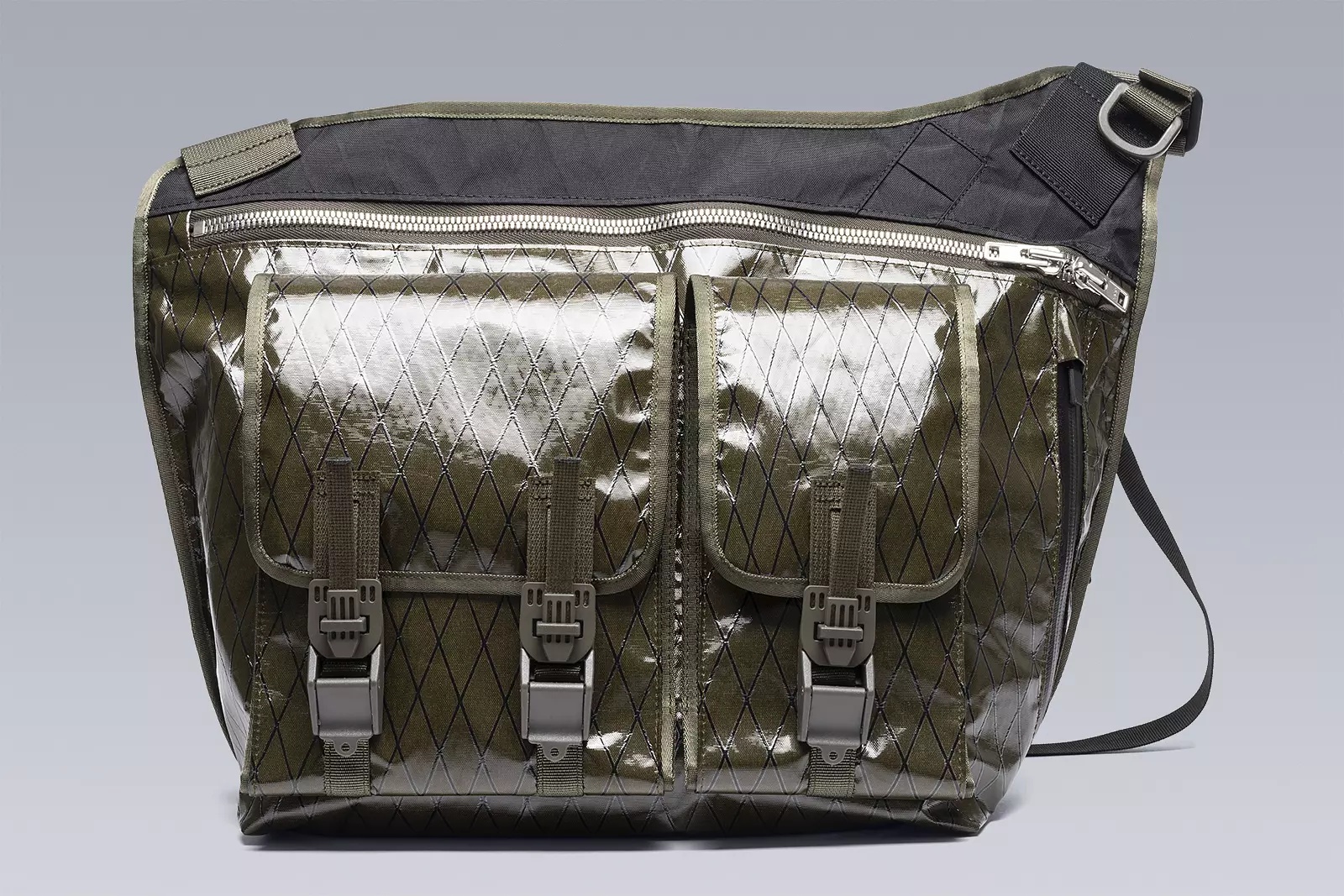 The original ACRONYM 3RD ARM INTEROPSǽ bag. Asymmetrical dynamical hybrid system. German military hardware. Ergonomic patterns. Kinaesthetic intent. Cadence, speed, and practicality in a use-driven adaptive load bearing system. Based on technology derived from competition sailcloth, the new FOIL F3 composite fabric delivers an exceptional use to weight ratio and a broken by design visual signature. The outer face of the fabric will crease and deform over time, creating irregularities that are intrinsic to the fabric. Surface deformation will vary with type and style of use. Fabric technology X-Pac® (78% PA, 22% PES) Fabric made in USA Sizing FORMAT: A4 _ [ + 27 × 42 cm ] Weight: 626g (Including removable parts) Systems ACRONYM INTEROPSǽ (PAT.) ACRONYM SOUNDǽ (PAT.) Subsystems Line I/Oǽ [ Gates: 3 ] QLQRǽ Strap Assembly _25-50 mm shoulder strap [ Removable ] _QLQR unit Pockets: 8 _External: 5 [ Mezzanine: 2 ] _Internal: 3 Includes 25-50 mm shoulder strap [ Removable ] Interface with All ACRONYM INTEROPSǽ jackets Actual product may differ from images.