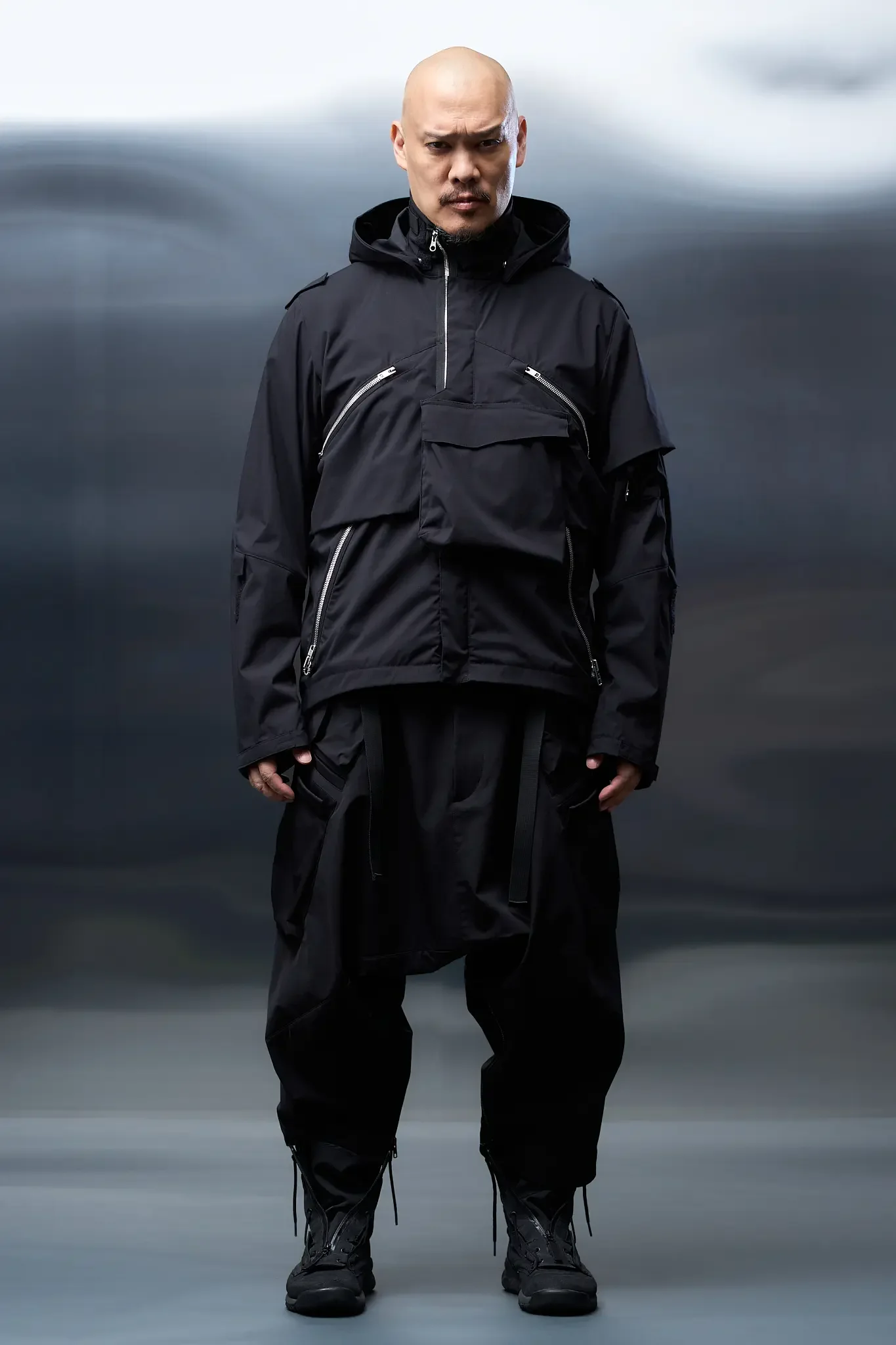 Schwermetall. J1W returns in microencapsulated nylon and metal. As the name suggests, J1W is the wide-body iteration of the ACRONYM J1A. It has been re-patterned to cover and conceal the broadest range of bodies, layers, and load bearing configurations to date. Standard non-standard J1A features include re-engineered TensionZipǽ Flak pocket and sleeve hitch tabs, zipless reloadable Gravity Pocketsǽ (smoother, faster, lighter), and removable Spike Tape ornaments featuring custom designed high-polish ACRONYM studs. J1A was the first ever jacket designed by Acronym. Originally conceived in the years between 1999 and 2001, it is the progenitor of the Type 2371*, and of every other Acronym jacket that has followed. J1W-E is the culmination of everything we have learned about building apparel since that time. Everything is new. Everything is the same. The very idea of ACRONYM rendered in physical, wearable form. A carefully balanced array of functional and aesthetic systems presented here in completely remastered form. Asymmetric. Dynamic. ACRONYM among equals. Combine with 3A-1, 3A-2, or 3A-3TS for full INTEROPSǽ functionality. Microencapsulated nylon is the original J1A fabric technology. As eminently wearable as at its debut in 2003, and not available since 2008. *Together with 3A-1, the Type 2371 jacket was released in 2002 as one of the main components of ACR KIT-1. KIT-1 was the first commercially available Acronym product. [ Shown in size: M. Fits: WIDE ] Fabric technology ENCAPSULATED NYLON (99% Polyamide, 1% Elastane) Water repellent, windproof, breathable Fabric made in USA Military specification ENCAPSULATED NYLON _(99% Polyamid, 1% Elasthan) _Wasserabweisend, Winddicht, Atmungsaktiv _Stoff hergestellt in USA _Militarische Spezifikation Sizing Size XS S M L XL 1/2 Chest 61 64 67 70 73 Length 63.5 66.5 69.5 72.5 75.5 Shoulders 15 15.5 15.5 16 16.5 Sleeves 59.6 61.5 62.5 65.5 67.5 All measurements are in centimeters. Weight: 1260g (size M, color: Black, including removable parts) Systems ACRONYM INTEROPSǽ (PAT.) ACRONYM SOUNDǽ (PAT.) Subsystems ForceLockǽ JacketSlingǽ EscapeZipǽ SpeedLockǽ Gravity Pocketǽ AuxZipǽ ( F ) TensionZipǽ Pockets: 10 _External: 9 [ Mezzanine: 1 ] _Internal: 1 Includes ForceLockǽ [ Removable ] JacketSlingǽ [ Removable ] Storm Hood [ Removable ] Spike tape [ Removable ] Logo tape [ Removable ] Interface with All ACRONYM INTEROPSǽ bags All ACRONYM AuxZipǽ ( M ) units Actual product may differ from images. Price including VAT and excluding shipping costs.
