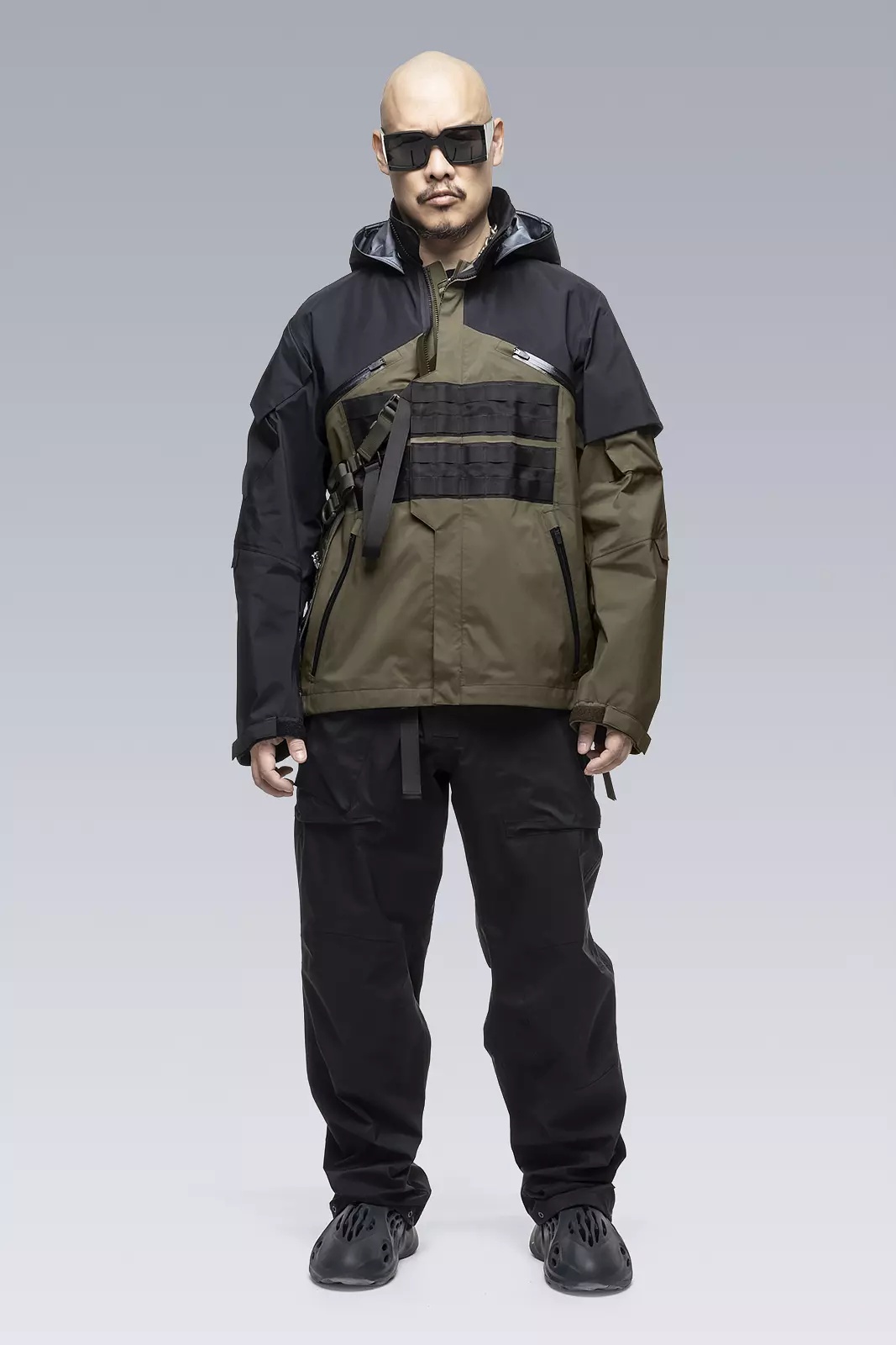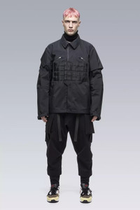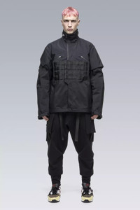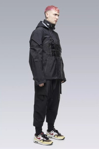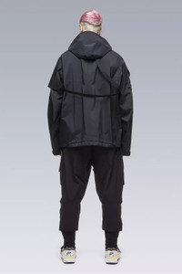 The very idea of ACRONYM rendered in physical, wearable form. A carefully balanced array of functional and aesthetic systems presented here in completely remastered form, and, for the first time, with TEC SYS webbing. Asymmetric. Dynamic. Modular. ACRONYM among equals. Combine with 3A-1, 3A-2, or 3A-3TS for full INTEROPSǽ functionality. Built with enhanced Gore-Tex® Pro most breathable technology** to provide extreme breathability—minimizing moisture buildup to give more comfort in more conditions—with retained ruggedness, uncompromised waterproof and windproof protection, and superior lightweight qualities with an improved environmental footprint. [ **Optimized for breathability during higher-intensity activities, while retaining the ruggedness and waterproof ratings for which Gore-Tex® Pro is known. This technology newly introduces the lightest laminates ever offered in the Gore-Tex® Pro category, using 30-denier face textiles and the new solution-dyed version of the robust Micro Grid™ backer. ] [ Shown in size: M. Fits: WIDE ] Fabric technology 3L GORE-TEX® PRO [Most breathable technology] (72% PA, 28% ePTFE) With solution-dyed Micro Grid™ backer for improved environmental footprint GUARANTEED TO KEEP YOU DRY™ Sizing Size XS S M L XL 1/2 Chest 62,5 65,5 68,5 71,5 74,5 Length 70 72 74 76 78 Shoulders 15 15,5 16 16,5 17 Sleeves 65,5 67,5 69,5 71,5 73,5 All measurements in centimeters. Weight: 880g (size M, color: Black, including removable parts) Systems ACRONYM INTEROPSǽ (PAT.) ACRONYM SOUNDǽ (PAT.) ACRONYM TEC SYS TEC SYS GRID: Rows: 4 Channels: 10 Subsystems ForceLockǽ JacketSlingǽ EscapeZipǽ SpeedLockǽ Gravity Pocketǽ AuxZipǽ ( F ) Pockets: 9 _External: 9 _Internal: 0 Includes ForceLockǽ [ Removable ] JacketSlingǽ [ Removable ] Storm Hood [ Removable ] Logo tape [ Removable ] Interface with All ACRONYM INTEROPSǽ bags All ACRONYM 3RD ARM Modular [ M ] pockets All ACRONYM AuxZipǽ ( M ) units Actual product may differ from images.