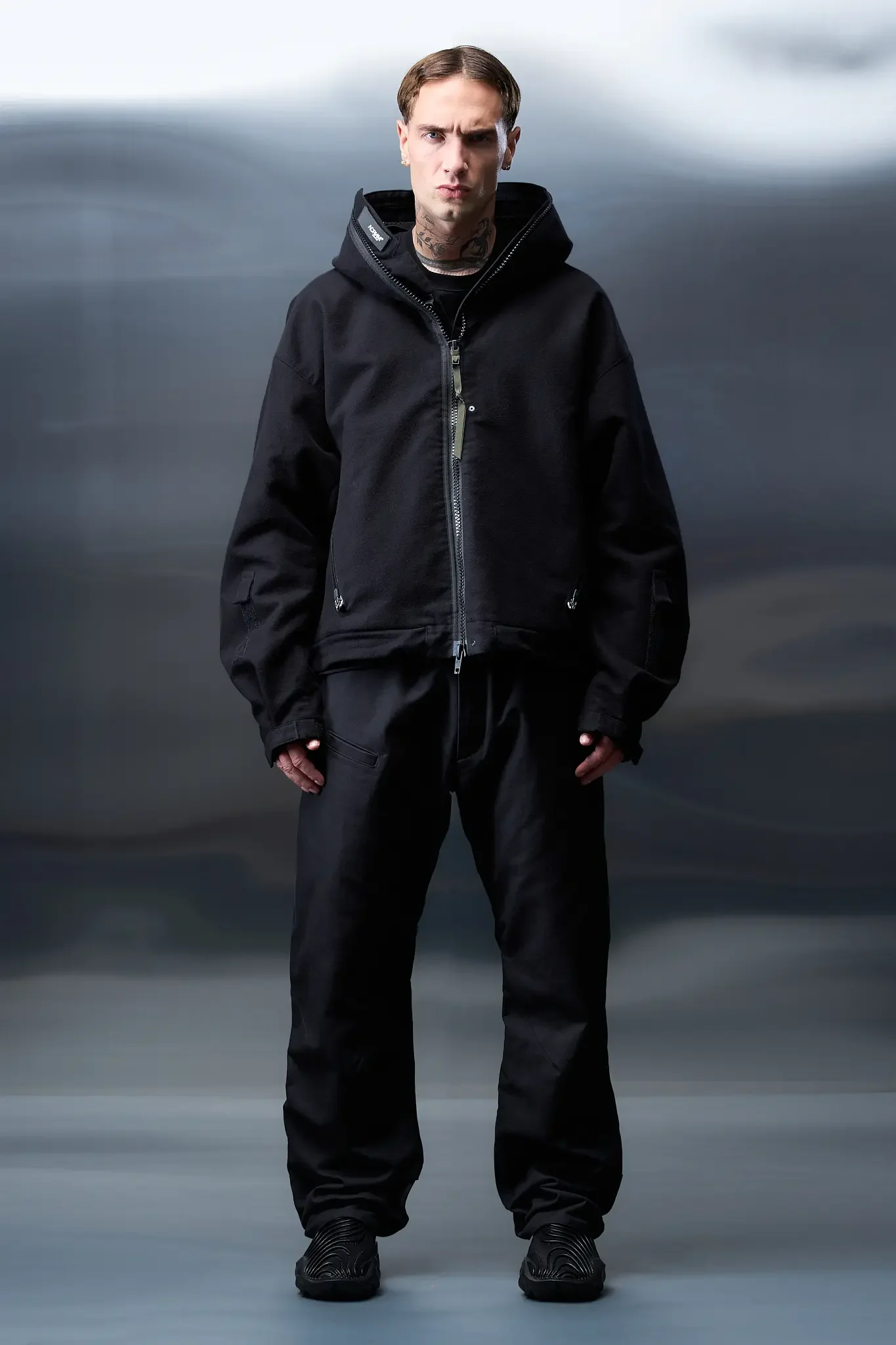J79-KI is a striking nonshell silhouette built for everyday ergonomics and utility. Its weft velvet moleskin fabric is quiet, elegant even, made in Germany, and most of all, resilient. A sculptural skin that moulds to your body over time. Its features are equally straightforward. Extra long sleeves for warmth and wind resistance without gloves. Extra long sleeve hitch tabs to hold those sleeves out of the way when dexterity is required. The overlap zip snorkel hood delivers customisable coverage: from wind cheating collar only, to complete concealment. Bi-lateral teardrop TensionZipǽ pockets provide out-sized storage. SpeedLockǽ shock cord hem compartmentalises air and adjusts shape. AuxZipǽ interfaces your jacket to other ACRONYM components so that you can better interface with your environment. Nonshell is a new category type featuring resilient fabrics and constructions without chemically constituted bonding or membranes. [ Shown in size: M. Fits: WIDE ] Fabric technology MOLESKIN _(HV Weft Velvet) _(100% Cotton) _Fabric made in Germany MOLESKIN _(HV Schuss-Samt) _(100% Baumwolle) _Stoff in Deutschland hergestellt Sizing Size XS S M L XL 1/2 Chest 74 77 80 83 86 Length 60 63 66 69 72 Shoulders 22 22.5 23 23.5 24 Sleeves 60 62 64 66 68 All measurements in centimeters. Weight: 1450g (size M, color Black) Subsystems JacketSlingǽ SpeedLockǽ TensionZipǽ AuxZipǽ ( F ) Pockets: Total: 2 _External: 2 _Internal: 0 Includes JacketSlingǽ [ Removable ] Logo tape [ Removable ] Interface with All ACRONYM AuxZipǽ ( M ) units Actual product may differ from images. Price including VAT and excluding shipping costs.