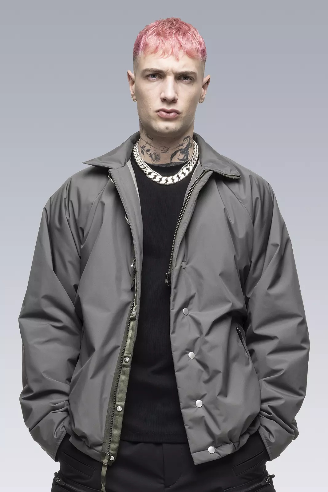 The perfect coach jacket. The J95-PL takes all the simplicity, attitude, and versatility of this ubiquitous staple, and injects it with the motion optimised and utility expanding DNA of ACRONYM. The 2-stage centre-front features EscapeZipǽ for swift entry and exit, as well as web tape mounted press buttons for one handed operation. An ingenious additional zipper converts the collar for full neck protection. The perfectly placed external pockets have bi-lateral pocket bags for maximum storage, while the internal security pockets are set in holster position allowing stable carry despite the jacket's lightweight construction and feel. The Speedlockǽ shockcord hem allows for rapid silhouette changes and air compartmentalization. Built in 2L GORE-TEX INFINIUM™ with WINDSTOPPER® technology and winterized with PRIMALOFT® Gold Insulation Active and a removable storm hood. [ Shown in size: M. Fits: STRAIGHT ] Fabric technology 2L GORE WINDSTOPPER® shell fabric (78% PES, 22% ePTFE) PRIMALOFT® GOLD INSULATION ACTIVE (80g/m²) (100% PES) Sizing Size XS S M L XL 1/2 Chest 57 60 63 66 69 Length 65,5 68,5 71,5 74,5 77,5 Shoulders 23,5 24 24,5 25 25,5 Sleeves 56 58 60 62 64 All measurments in centimeters. Weight: 700g (size M, color: Black, including removable parts) Subsystems ForceLockǽ JacketSlingǽ EscapeZipǽ SpeedLockǽ AuxZipǽ ( M ) Pockets: 4 _External: 2 _Internal: 2 Includes ForceLockǽ [ Removable ] JacketSlingǽ [ Removable ] Logo tape [ Removable ] Storm Hood [Removable] Interface with All ACRONYM AuxZipǽ ( F ) units Actual product may differ from images.