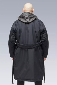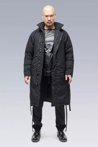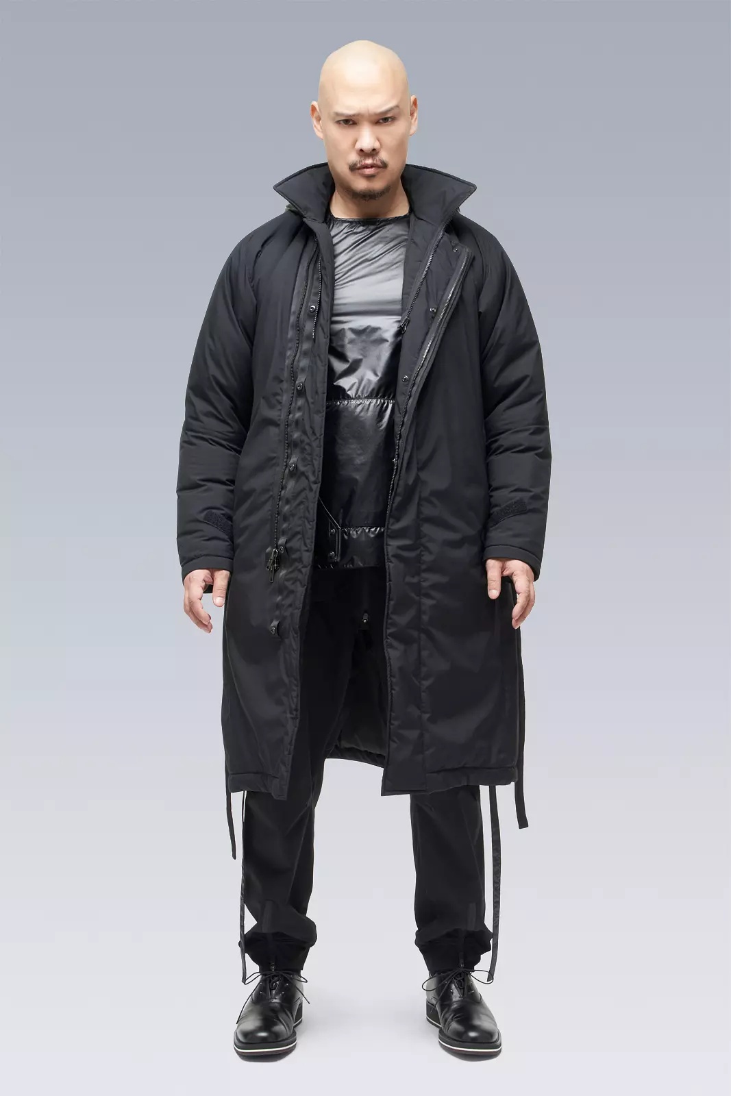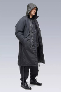 The over-overcoat. Built around a core of Climashield® continuous filament insulation and with a shell of 2-layer Gore-Tex Infinium™ Windstopper®, J99 is a floating cloud fortress of winter well-being. It's sophisticated (180+ pattern pieces) multi-panel ergonomic shape will envelop almost any outfit, and it's seemingly endless list of features and details will meet almost any demand. Of particular note are the multi-stage and multi-position center front storm flaps and collar, the fully taped 'film-out' stowable storm hood, the internal SpeedLockǽ waist gaiter for air compartmentalisation, and an all new integrated JacketSlingǽ that disappears inside the waist of the coat when not in use. [ Shown in size: M. Fits: WIDE. ] Fabric technology 2L GORE-TEX INFINIUM™ WINDSTOPPER® shell fabric (78% PES, 22% ePTFE) bluesign® certified and with PFC free DWR CLIMASHIELD® continuous filament insulation (100% PES) Lining fabric (100% PES) Hood in 2 Layer ePTFE fabric [ Taped ] Sizing Size S M L XL 1/2 Chest 75 77 79 81 Length 108 111 114 117 Shoulders 19 19.5 20 20,5 Sleeves 64 66 68 70 All measurements in centimeters. Weight: 1340g (size M, color Black, including removable parts) Systems ACRONYM SOUNDǽ (PAT.) Subsystems ForceLockǽ JacketSlingǽ SpeedLockǽ Pockets: 6 _External: 4 _Internal: 2 Includes ForceLockǽ [ Removable ] JacketSlingǽ [ Removable ] Logo tape [ Removable ] Belt [ Removable ] Actual product may differ from images.
