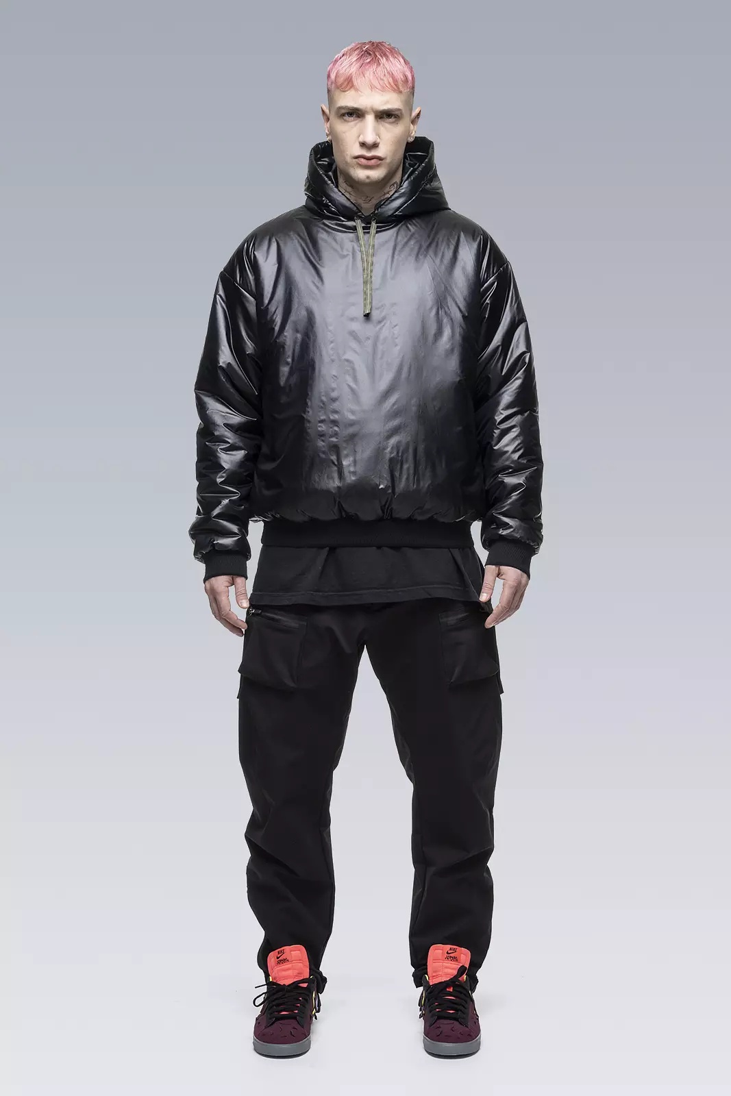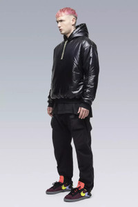 Tech bubble. Ultralight hooded insulator with concealed zip pocket, new semi-internal JacketSlingǽ, and dimensional flex laminate cuffs and hem. Imagine a sweatshirt. Now imagine everything about that sweatshirt redesigned by Acronym and crossbred with a sleeping bag. A halo of liquid comfort that floats between inner and outer layers like no other garment. Standard hoody drawstrings have been replaced with our proven rapid adjust tape (two layers of tape stitched together to form an 'x' cross section, allowing the tape to 'lock-in' when knotted, yet also remain easy to untie). New semi-internal mount brings full JacketSling functionality to drop-in shells. JacketSlingǽ disappears into and emerges from the garment lining smooth as magic. Dimensional flex laminate cuffs utilise spatial distortion for elasticity, a waterproof breathable membrane for water resistance, and will not retain water even if submerged. Please note: HD Nylon fabric will become slightly more matte with time and washing. [ Shown in size: M. Fits: STRAIGHT ] Fabric technology HD NLYON with PRIMALOFT® GOLD INSULATION ACTIVE (133g/m²) Shell: 100% PA Insulation: 100% PES Lining: 100% PES Sizing Size XS S M L XL 1/2 Chest 61 64 67 70 73 Length 63,5 66,5 69,5 72,5 75,5 Shoulders 19 19,5 20 20,5 21 Sleeves 59,5 61,5 63,5 65,5 67,5 All measurments in centimeters. Weight: 465g (size M, color: Black, including removable parts) Subsystems JacketSlingǽ Pockets: 1 _External: 1 _Internal: 0 Includes JacketSlingǽ [ Removable ] Actual product may differ from images.