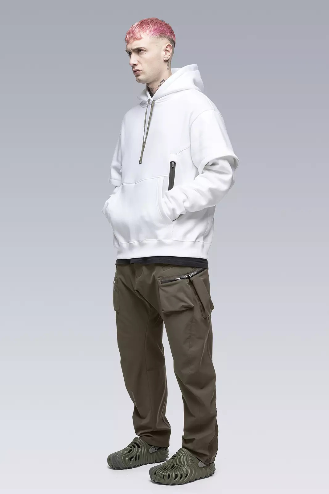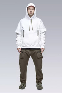 Custom fit cotton hooded sweatshirt with doubled sleeves and a partially hidden right sleeve print. Classic kangaroo pocket joined by dual holster position security pockets with size reverse coild zip closures. Standard hoody drawstrings have been replaced with our proven rapid adjust tape (two layers of tape stitched together to form an 'x' cross section, allowing the tape to 'lock-in' when knotted, yet also remain easy to untie [ Shown in size: M. Fits: STRAIGHT ] Fabric technology HEAVY JERSEY (100% CO) Made in Portugal Sizing Size XS S M L XL 1/2 Chest 61 64 67 70 73 Length 64 67 70 73 76 Shoulders 16 16.5 17 17.5 18 Sleeves 64 66 68 70 72 All measurements in centimeters. Weight: 990g (size M, color Black) Subsystems Pockets: 4 _External: 4 _Internal: 0 Actual product may differ from images.