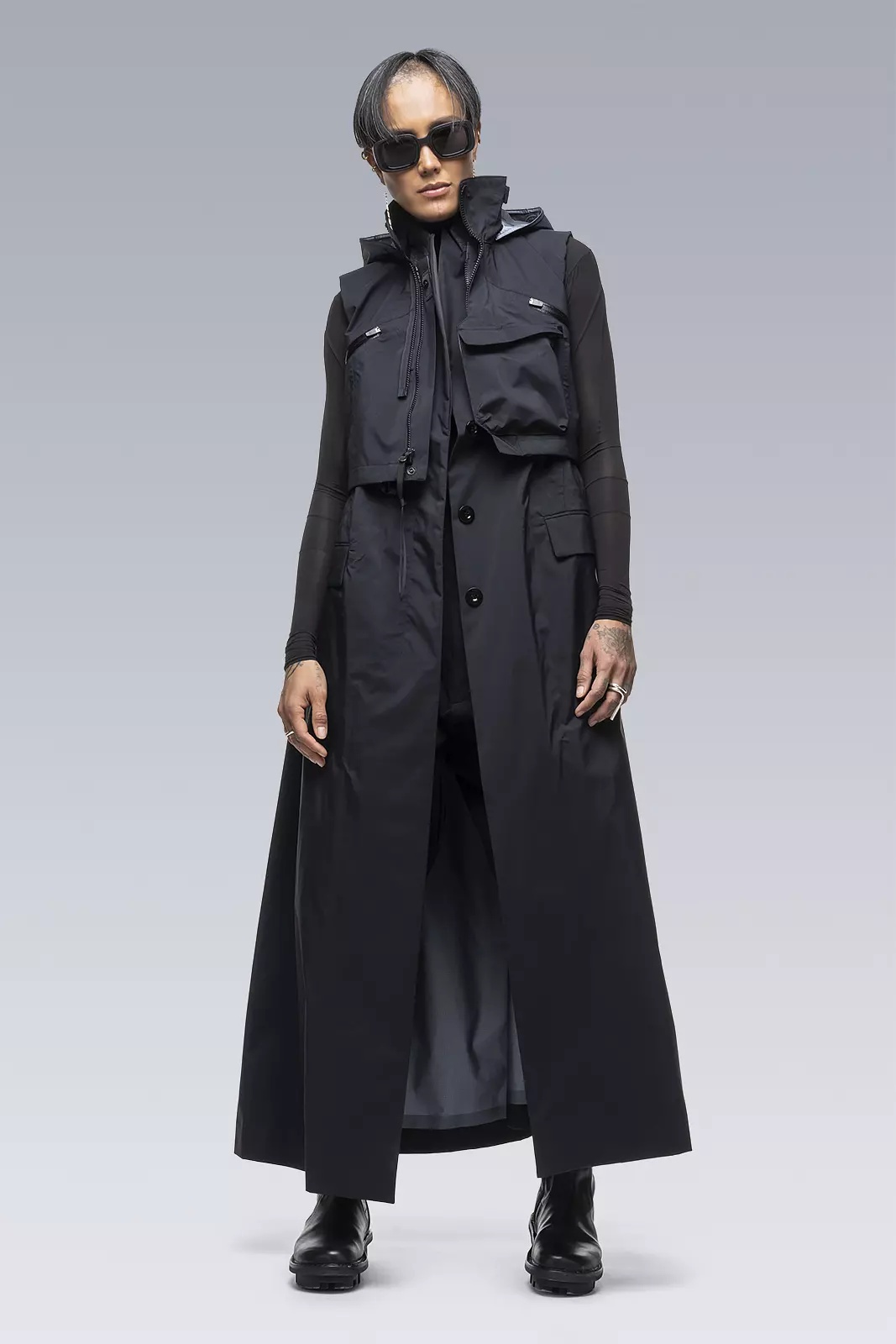 J6010 is sacai's aesthetic reframing of the Acronym J1W-GTPL design**. Following sacai methodology, it preserves hallmark attributes while fundamentally altering volume, silhouette, and typology. A trench coat and dress hybrid, it features a complex multilayer design. A vest-like top layer rests above a sleeveless coat-like under layer which descends to full dress length. Made in Japan by sacai. Shown in size: 1/S (Fa', 180 cm) [ Fits: STRAIGHT ] **sacai man 2022 Spring & Summer, women's 2022 Pre Spring collection Riffing on a theme of bonding, both as a metaphor for unity and as a technique for joining together two materials - two ideas that have been at the heart of sacai since the beginning. The collection by founder and designer, Chitose Abe, is a study on sealing together two apparently disparate notions to make a new form, bringing together characteristics born of different, sometimes opposing, origins. The ultimate expression of the idea comes courtesy of a collaboration with ACRONYM®, combining the designer Errolson Hugh's signature technical details with sacai fabrics and shapes for men and women, and, for the first time for ACRONYM®, a dress silhouette. Hugh says, 'Having known Chitose, and of course sacai, for many years, this collaboration is the ideal kind of crosspollination. And as I believe you can see from the results, it's a true blend of the philosophies of both brands, where the sum is greater than the parts.' Fabric technology Main Fabric 72% PA, 28% ePTFE Secondary Fabric 100% PA Inner Collar 90% Wool, 10% PA Sizing Size S M L XL 1 2 3 4 1/2 Chest 53 55 57 59 Length 139 143 147 151 Shoulders 11 11,5 12 12,5 All measurements in centimeters. Weight: 1100g (size M, including removable parts) Actual product may differ from images.