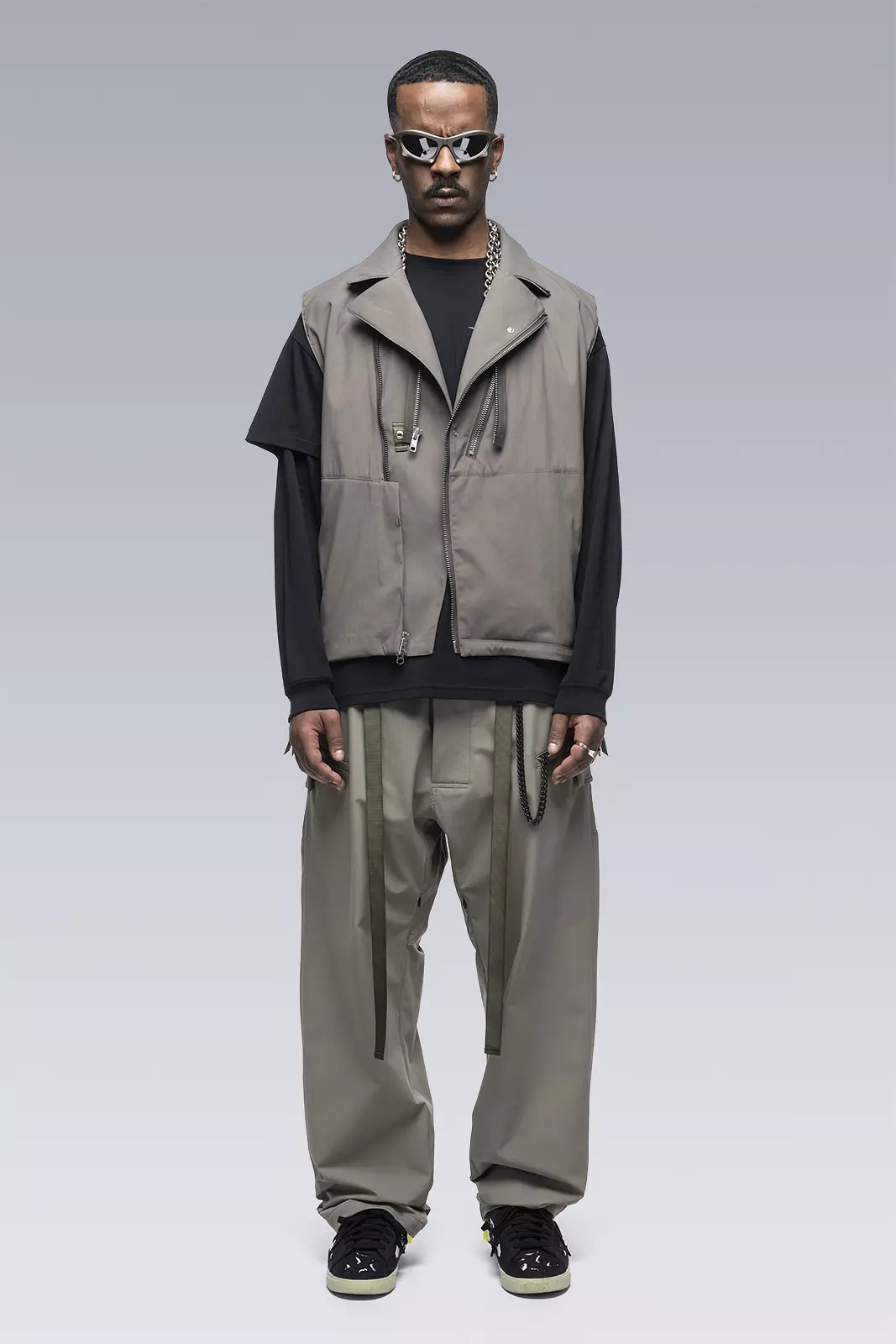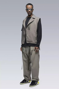 The well loved 68 biker jacket block rendered as a lightweight sleeveless vest in military specification nylon. [ Shown in size: M. Fits: PROFILE ] Fabric technology NYLON STRETCH (98% PA, 2% EL) Water repellent, breathable Fabric made in USA Military specification Sizing Size XS S M L XL 1/2 Chest 54.5 57.5 60.5 63.5 66.5 Length 53 56 59 62 65 Shoulders 14 14,5 15 15,5 16 All measurments in centimeters. Weight: 480g (size M, color: Black, including removable parts) Systems ACRONYM SOUNDǽ (PAT.) Subsystems ForceLockǽ [ Removable ] JacketSlingǽ [ Removable ] Logo tape [ Removable ] SpeedLockǽ Pockets: 3 _External: 3 _Internal: 0 Includes JacketSlingǽ [ Removable ] Actual product may differ from images.
