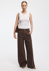 Our ABE wide-leg denim pants are made of pure cotton. This piece has a cool, vintage look thanks to the wash. It features seams running down the front and back, adding a sculptural effect to the relaxed silhouette. Size and Fit Fits true to size, take your normal size. The model is 173 cm and wears a size 36. Fabric and Care 100% Cotton Hand wash at 30°C, Do not bleach, Do not tumble dry, Iron at medium temperature, Suitable for dry cleaning, Suitable for professional wet cleaning