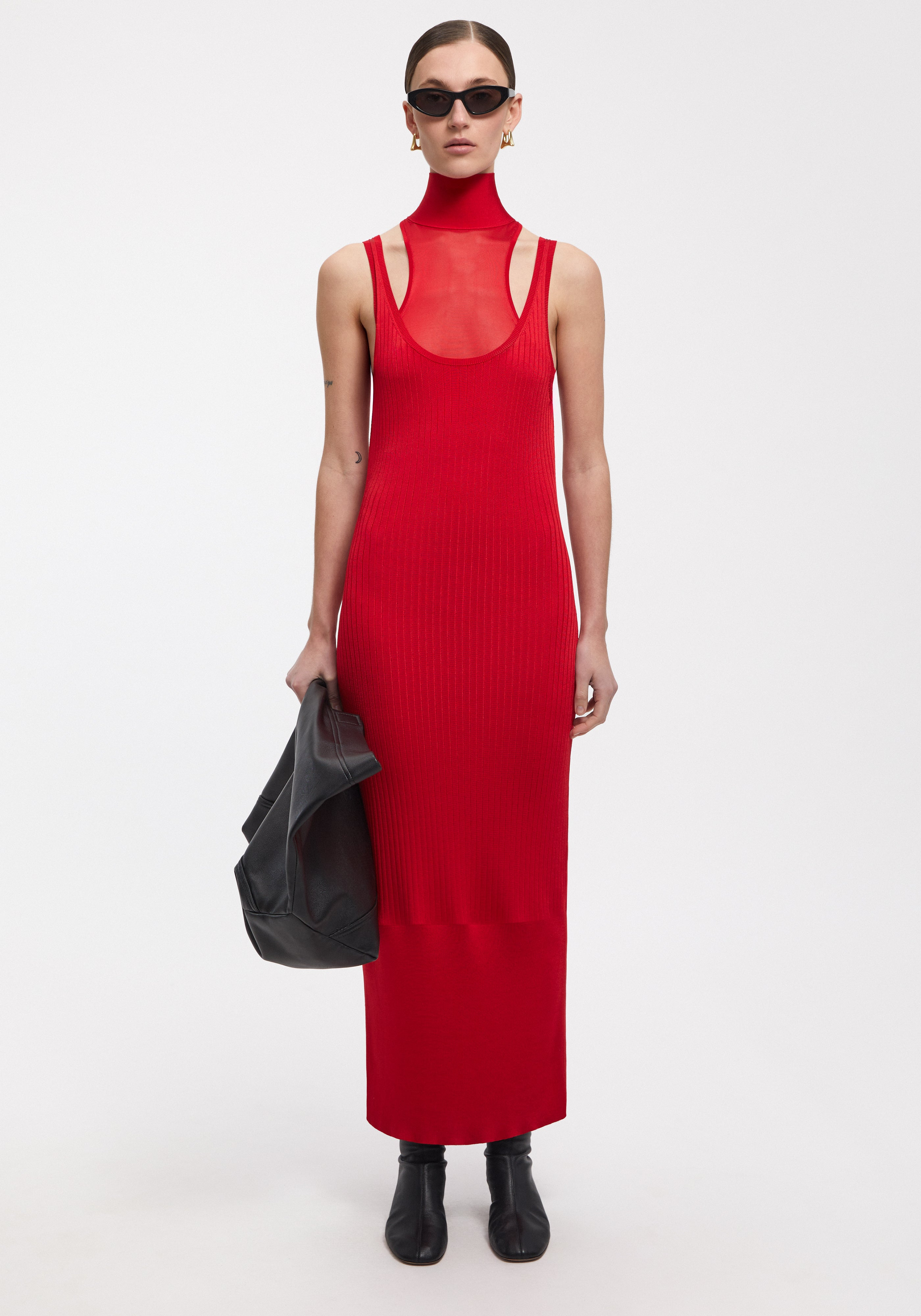 Our CAY knitted maxi dress is made of a technical stretch blend, designed to offer structure and comfort. Designed with a sleek ribbed texture, this ankle-grazing piece features a double shoulder strap detail and is layered with a sheer, high-neck mesh panel that ties elegantly at the back, adding both contrast and sophistication. Size and Fit Fits true to size, take your normal size. The model is 180 cm and wears a size S. Fabric and Care 75% rayon 22% nylon 3% spandex Hand wash at 30°C, Do not bleach, Do not tumble dry, Iron low temperature, Do not wring, Dry flat, Suitable for dry cleaning, Suitable for professional wet cleaning