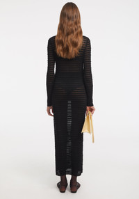 Our COLT maxi dress is crafted from a semi-sheer knit with a subtle textured stripe pattern. Designed for a close fit, it effortlessly follows the body's natural lines, creating a streamlined silhouette. The mock neck and long sleeves offer balance to the transparent finish, making it a refined yet daring piece. Size and Fit Fits true to size, take your normal size. Fabric and Care 80% viscose, 15% nylon, 4% polyester, 1% elastane Hand wash at 30°C, Do not bleach, Do not tumble dry, Do not iron, Dry clean, Do not wring