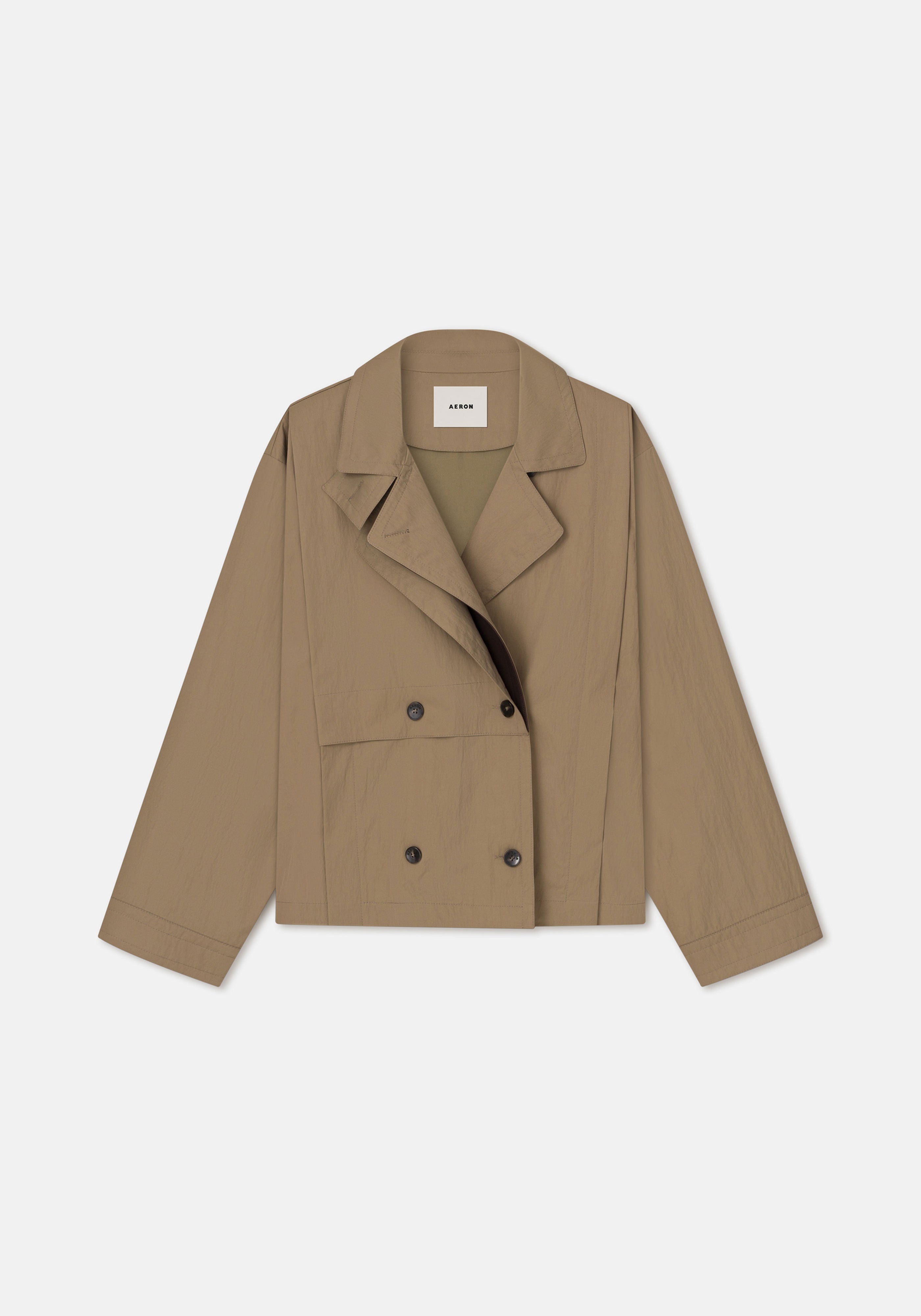 Our CORAL cropped trench jacket is crafted from a lightweight, wind-resistant technical fabric. This piece features an oversized silhouette with wide sleeves, double-breasted closure, and a distinctive cropped length for a contemporary edge. A smooth leather lapel insert adds unexpected texture and contrast at the collar, enhancing its sculptural structure. Size and Fit Fits true to size, take your normal size. The model is 173 cm and wears a size 36. Fabric and Care 100% Recycled Nylon Details: 100% Leather Do not wash, Do not bleach, Do not tumble dry, Iron at low temperature, Suitable for dry cleaning, Suitable for professional wet cleaning