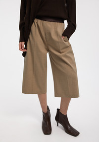 Our DON bermuda shorts are tailored from a smooth recycled polyester and viscose blend. Designed with a wide-leg silhouette that falls just below the knee, they offer an effortlessly sophisticated look with all-day comfort. This piece has an elasticated waistband that provides a relaxed fit, while pressed front pleats and discreet side pockets add subtle structure and functionality. Size and Fit Fits true to size, take your normal size. The model is 173 cm and wears a size 36. Fabric and Care 67% Recycled Polyester 29% Viscose 4% Elastane Do not wash, Do not bleach, Do not tumble dry, Iron at medium temperature, Suitable for dry cleaning, Suitable for professional wet cleaning