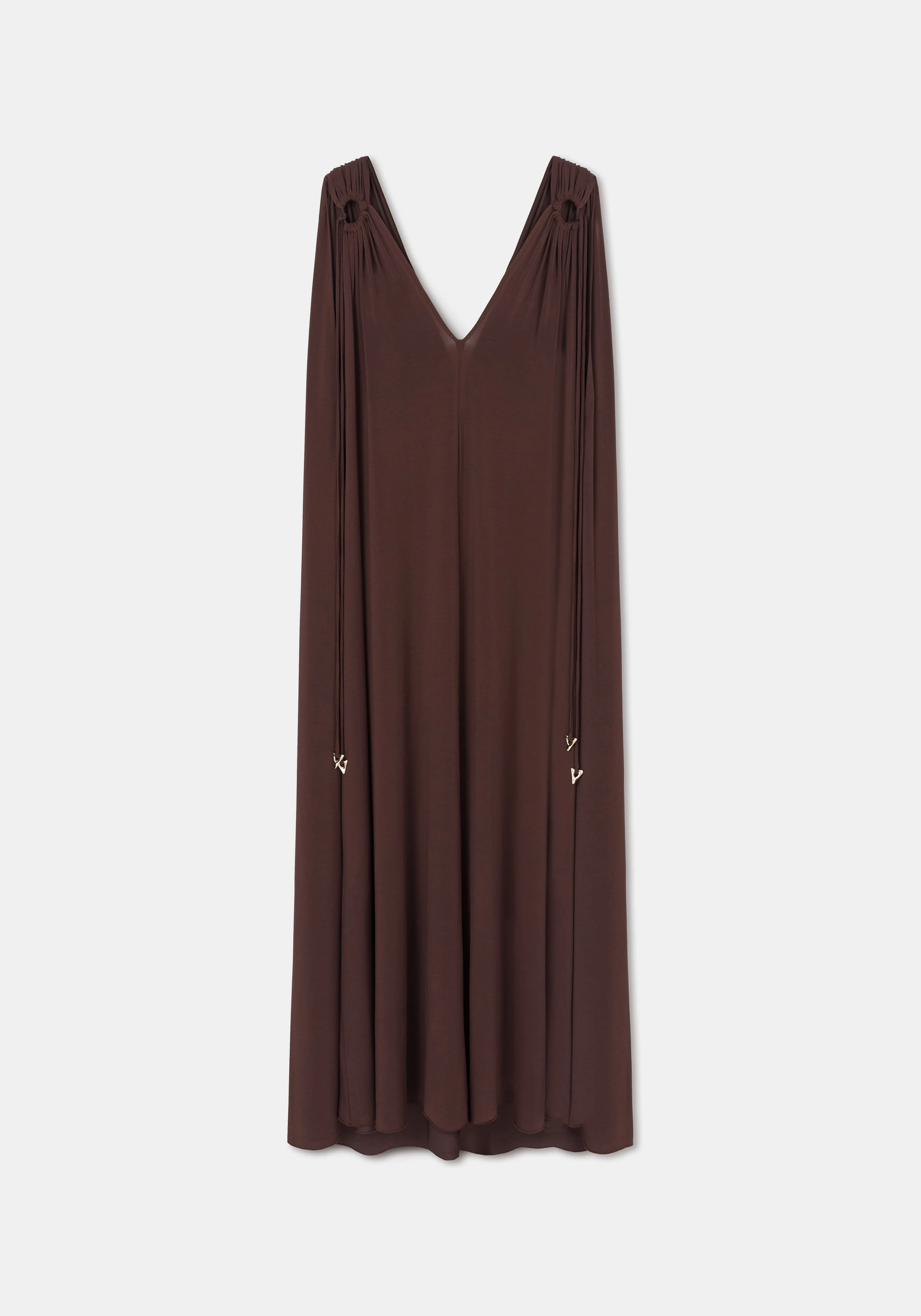 Our DORIS gathered jersey maxi dress is made of a sustainable FSC-certified viscose and elastane blend for a soft, stretchy and fluid fit. This sleeveless style features a plunging V-neckline at both front and back, with gathered shoulder detailing and hanging A-motifs. The full-length silhouette drapes beautifully, while subtle drawstring details allow for adjustable volume and shape. Size and Fit Fits true to size, take your normal size. The model is 173 cm and wears a size S. Fabric and Care 93% FSC Viscose 7% Elastane Hand wash at 30°C, Do not bleach, Do not tumble dry, Iron at a medium temperature, Suitable for dry cleaning, Suitable for professional wet cleaning
