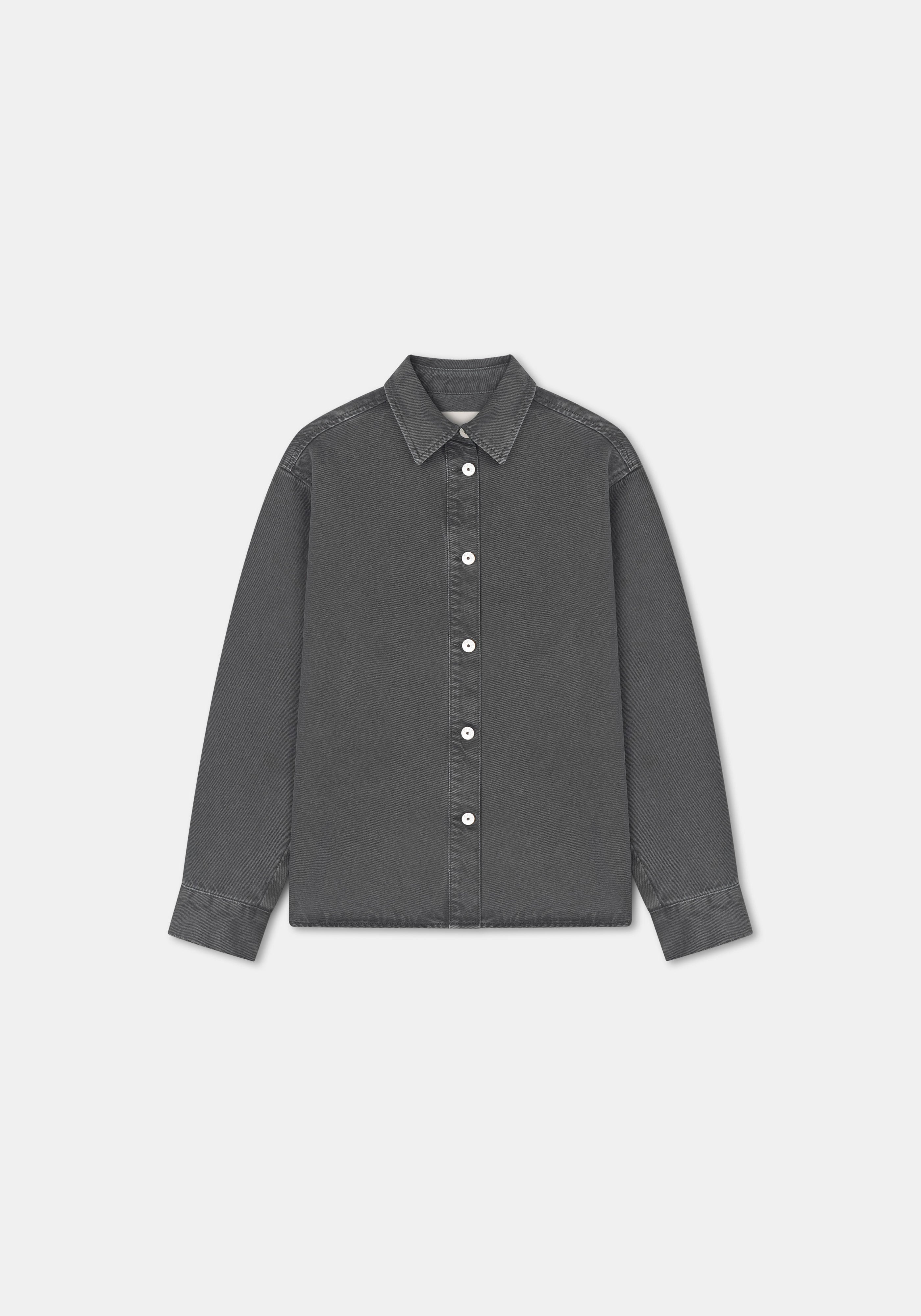 Our DUSK denim overshirt is made of pure cotton. This piece is designed with a high-rise waist and wide-leg silhouette for a modern yet timeless shape. The washed grey tone adds versatility, while the exposed button-fly closure gives it a utilitarian touch. Size and Fit Fits true to size, take your normal size. Fabric and Care 100% cotton Hand wash at 30°C, Do not bleach, Do not tumble dry, Iron at low temperature, Dry clean