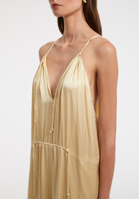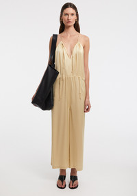 Our FAUNA satin jumpsuit is part of our Summer Occassions upcycled collection, made of deadstock fabrications from our archive and produced in our home, Hungary. Crafted from a sustainable FSC-certified viscose, this piece has an airy, relaxed fit with an adjustable waistline and an open-back. It has tonal knotted strings and a fringed hemline. Size and Fit Designed for a relaxed fit, take your normal size. However those who is between sizes should take the smaller size. Fabric and Care 100% FSC Viscose Do not wash. Do not bleach, Do not tumble dry, Iron low temperature, Suitable for dry cleaning, Suitable for professional wet cleaning