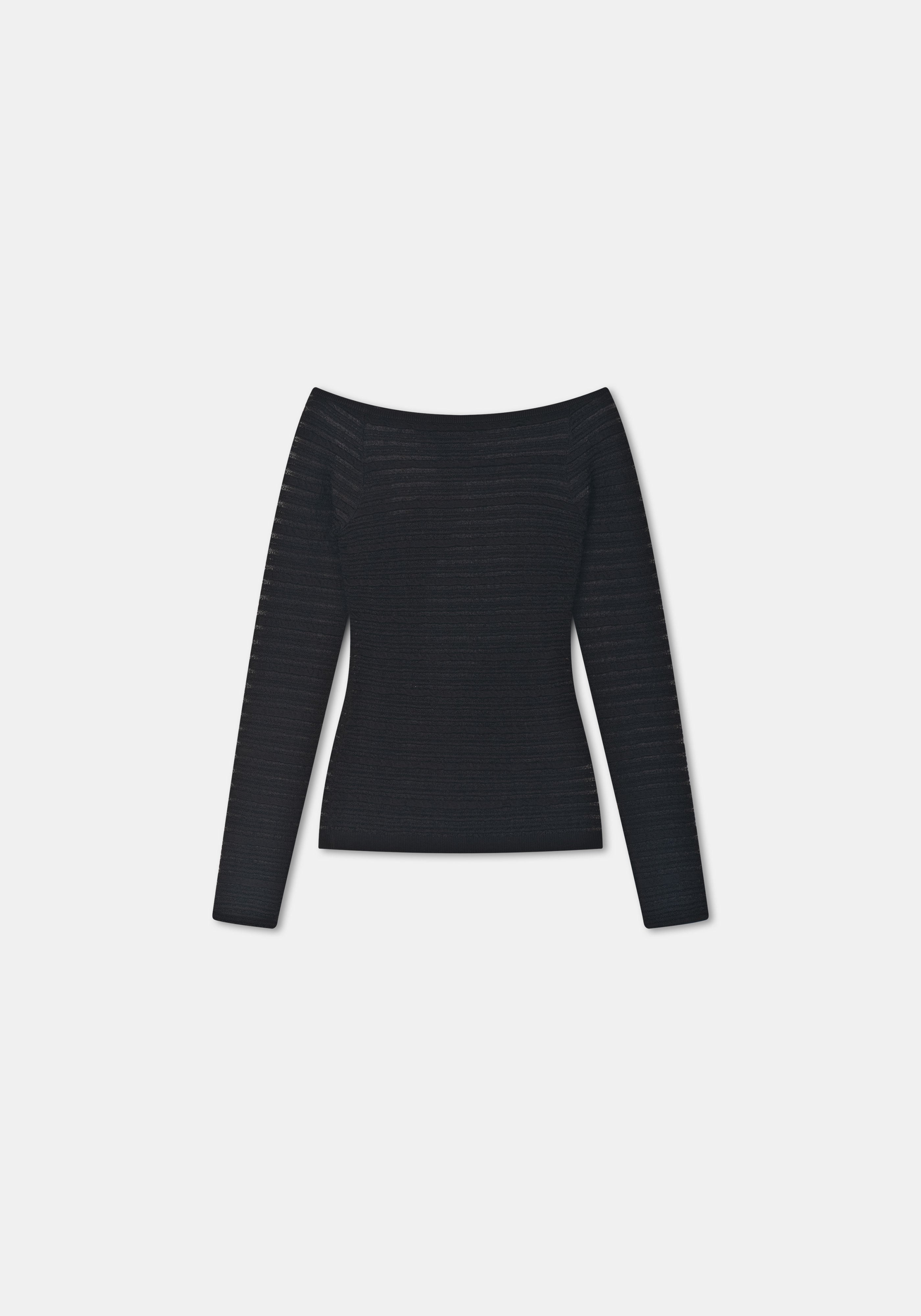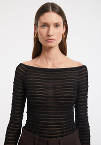 Our HUDSON off-shoulder top has a semi-sheer body with a delicate, textured stripe pattern that adds dimension to its fitted silhouette. This feminine piece features a wide neckline that sits elegantly off the shoulders, making it ideal for layering or wearing on its own as a subtle statement. Size and Fit Fits true to size, take your normal size. Fabric and Care 80% viscose, 15% nylon, 4% polyester, 1% elastane Hand wash at 30°C, Do not bleach, Do not tumble dry, Do not iron, Dry clean, Do not wring