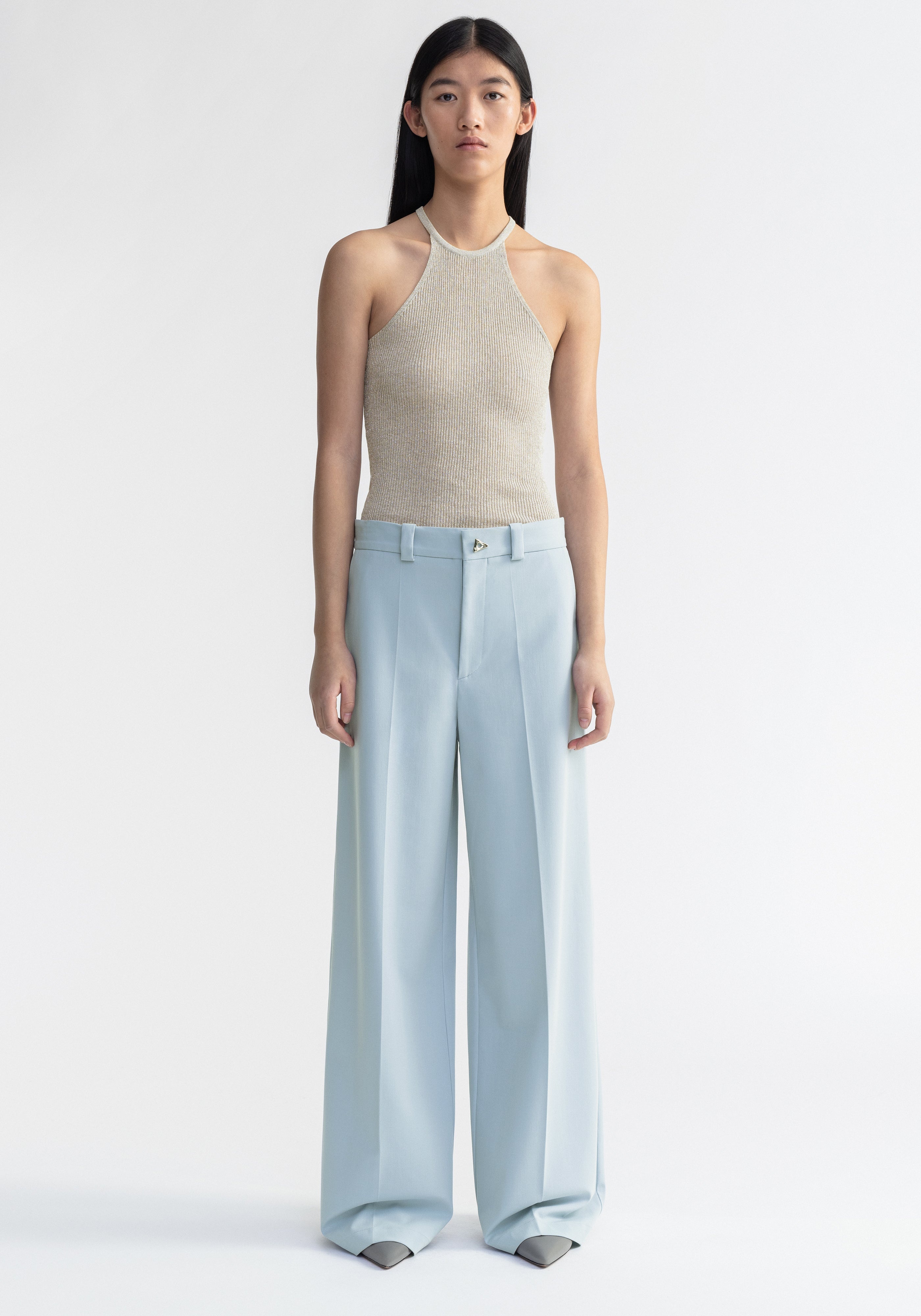 Our KAI wide leg suiting pants are tailored of a sustainable, ecovero viscose and recycled polyester blend. This piece has a relaxed fit and sharp crease lines to emphasize their shape. It is accentuated with our signature A-button at the waist. Wear with our GALINA top for a chic look. Size and Fit Fits true to size, take your normal size. The model is 180 cm and wears a size 36. Fabric and Care 66% Recycled Polyester 28% Ecovero Viscose 6% Elastane Do not wash, Do not bleach, Do not tumble dry, Iron low temperature, Suitable for dry cleaning, Suitable for professional wet cleaning