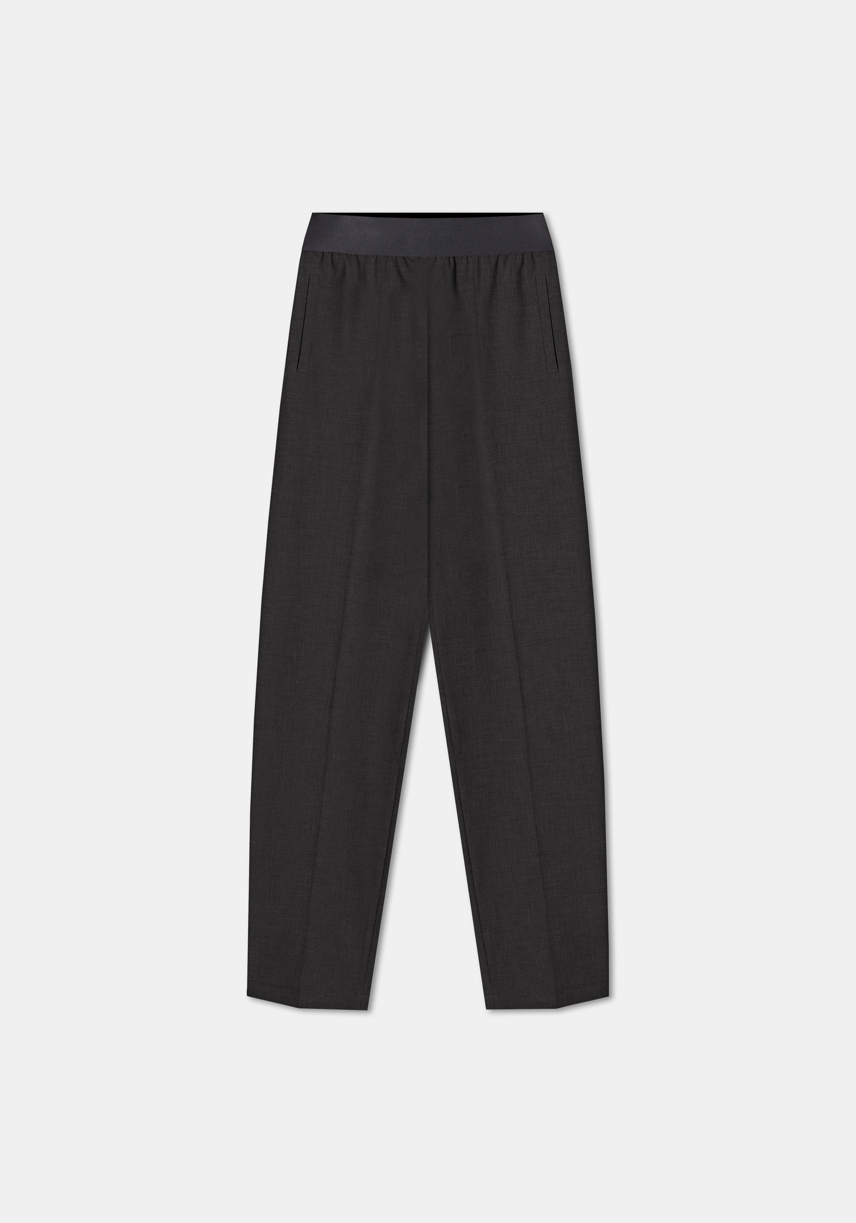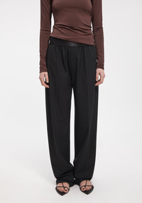 Our KIRK straight-leg suiting pants are made of a smooth recycled polyester and viscose blend. Designed with a relaxed, full-length silhouette, these trousers feature an easy elasticated waistband, front pleats, and side pockets for a tailored look with everyday comfort. Size and Fit Fits true to size, take your normal size. The model is 180 cm and wears a size 36. Fabric and Care 67% Recycled Polyester 29% Viscose 4% Elastane Do not wash, Do not bleach, Do not tumble dry, Iron at medium temperature, Suitable for dry cleaning, Suitable for professional wet cleaning