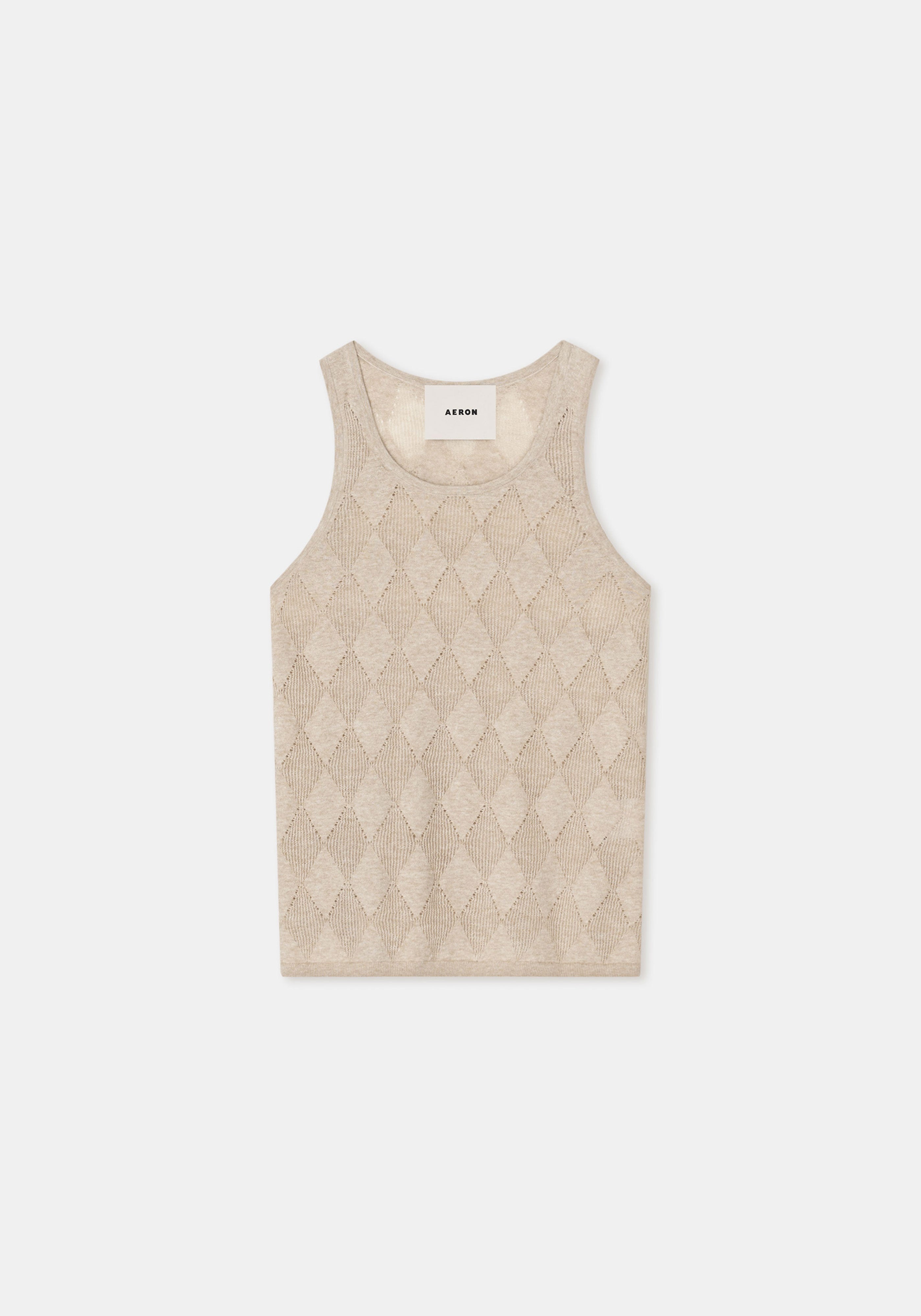 Our KISMET top is made of a linen, cotton and CiCLO® recycled polyester blend. This piece has a delicate, loosely knitted structure that creates a semi-sheer look featuring a diamond pattern. It has a relaxed fit and a racer neck. Size and Fit Fits true to size, take your normal size. The model is 180 cm and wears a size S. Fabric and Care 30% Linen 39% Cotton 17% CiCLO®Recycled Polyester 14% Nylon Hand wash at 30°C, Do not bleach, Do not tumble dry, Iron low temperature, Do not wring, Dry flat, Suitable for dry cleaning, Suitable for professional wet cleaning