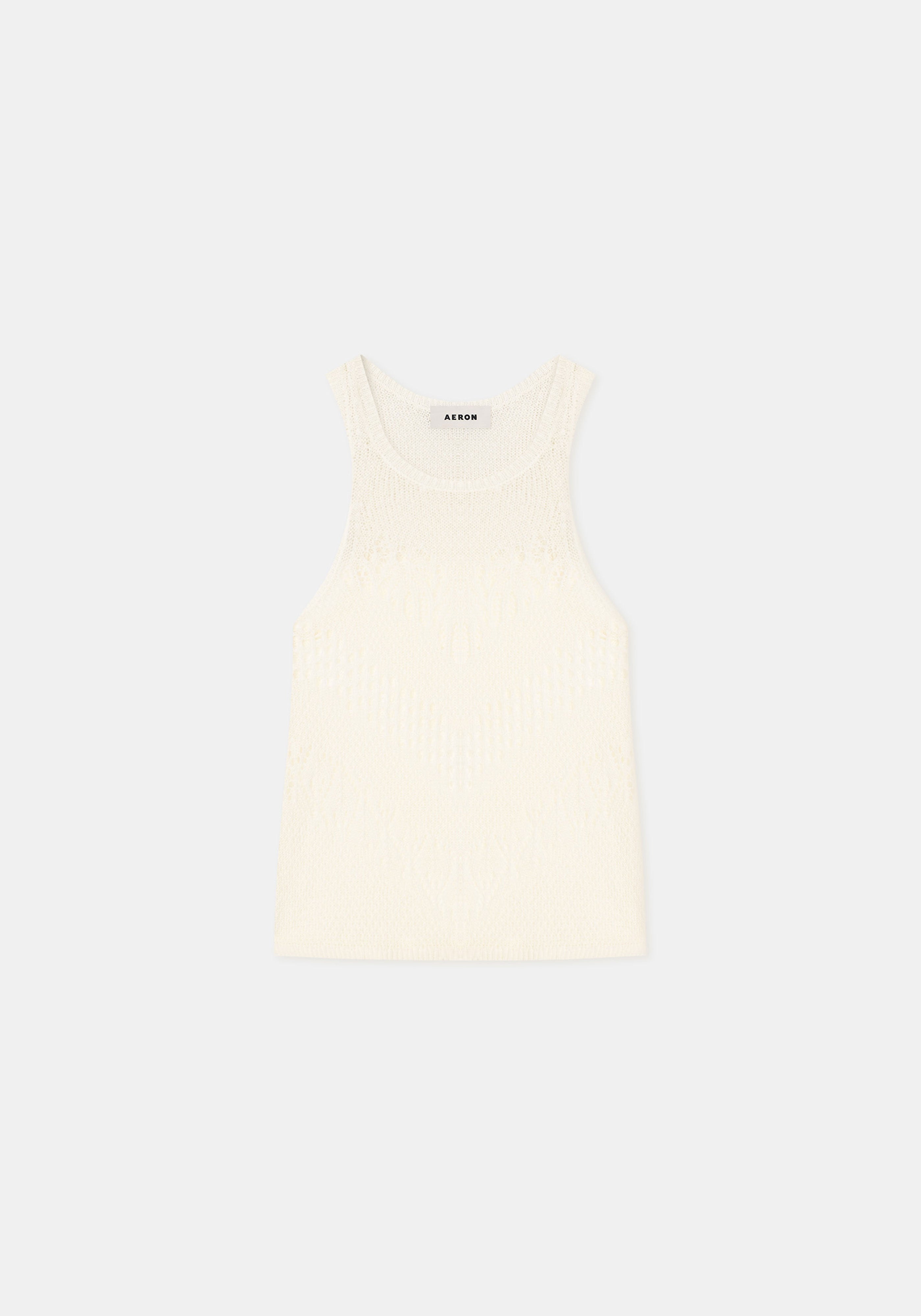 Our KISMET sleeveless top is made of pure cotton. This piece has a regular fit and a racer neck, featuring a semy-sheer body with an intricate lace knit pattern. Size and Fit Fits true to size, take your normal size. The model is 180 cm and wears a size S. Fabric and Care 100% Cotton Do not wash, Do not bleach, Do not thumble dry, Do not iron, Do not wring, Dry flat, Suitable for dry cleaning