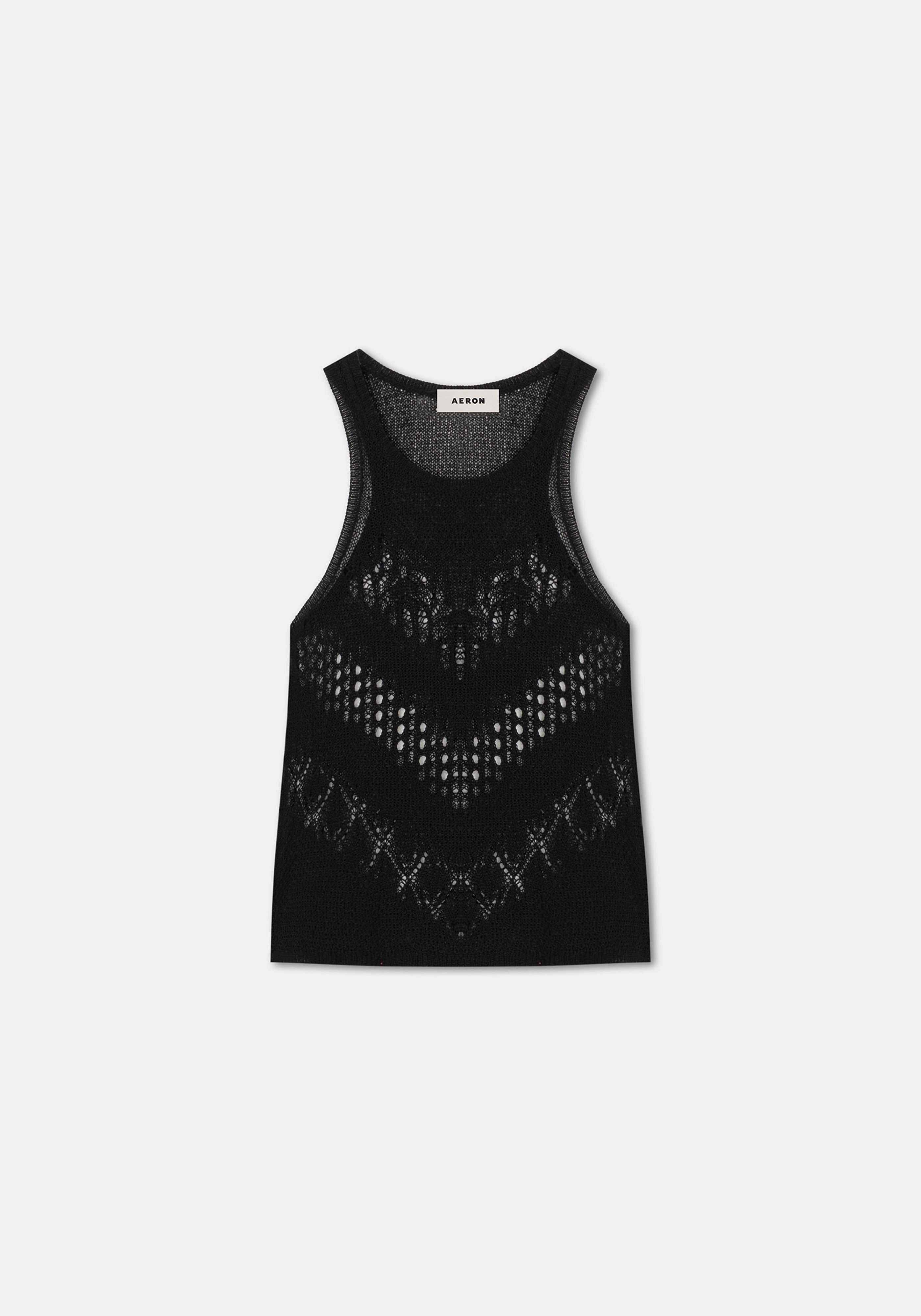 Our KISMET sleeveless top is made of pure cotton. This piece has a regular fit and a racer neck, featuring a semy-sheer body with an intricate lace knit pattern. Size and Fit Fits true to size, take your normal size. The model is 180 cm and wears a size S. Fabric and Care 100% Cotton Do not wash, Do not bleach, Do not thumble dry, Do not iron, Do not wring, Dry flat, Suitable for dry cleaning